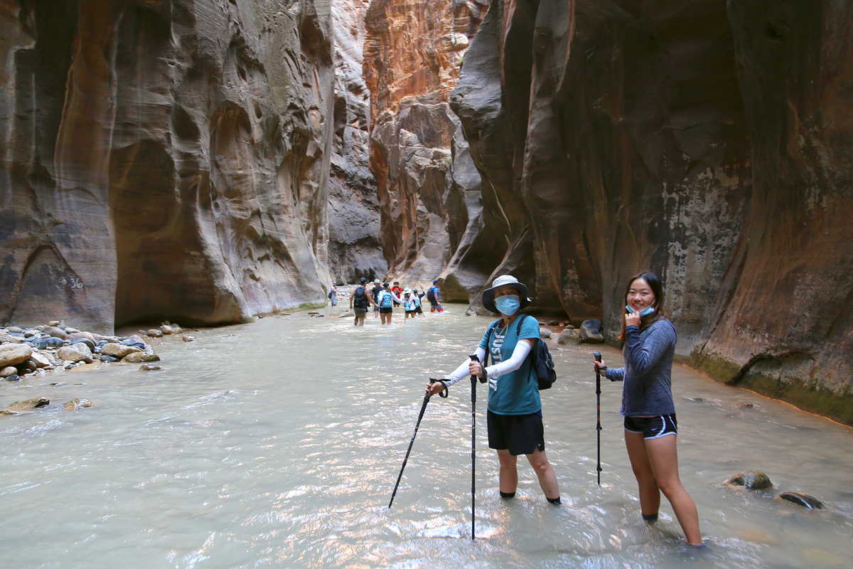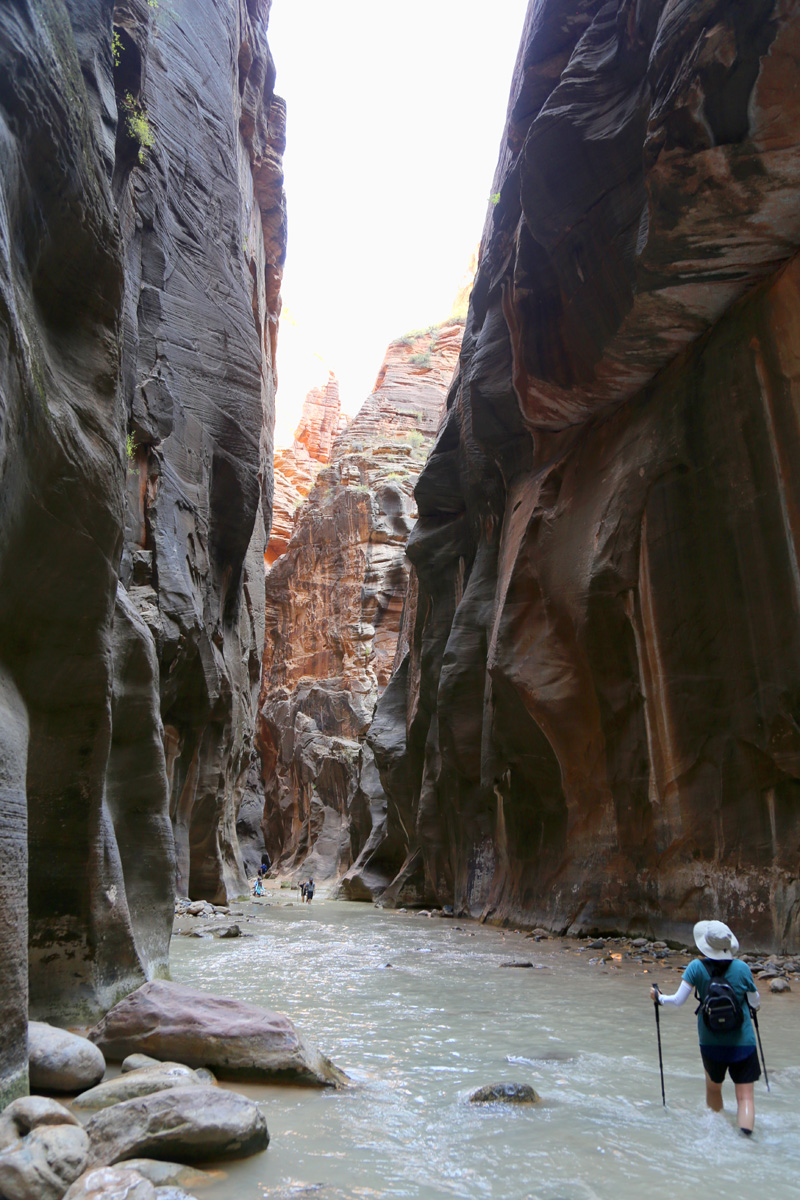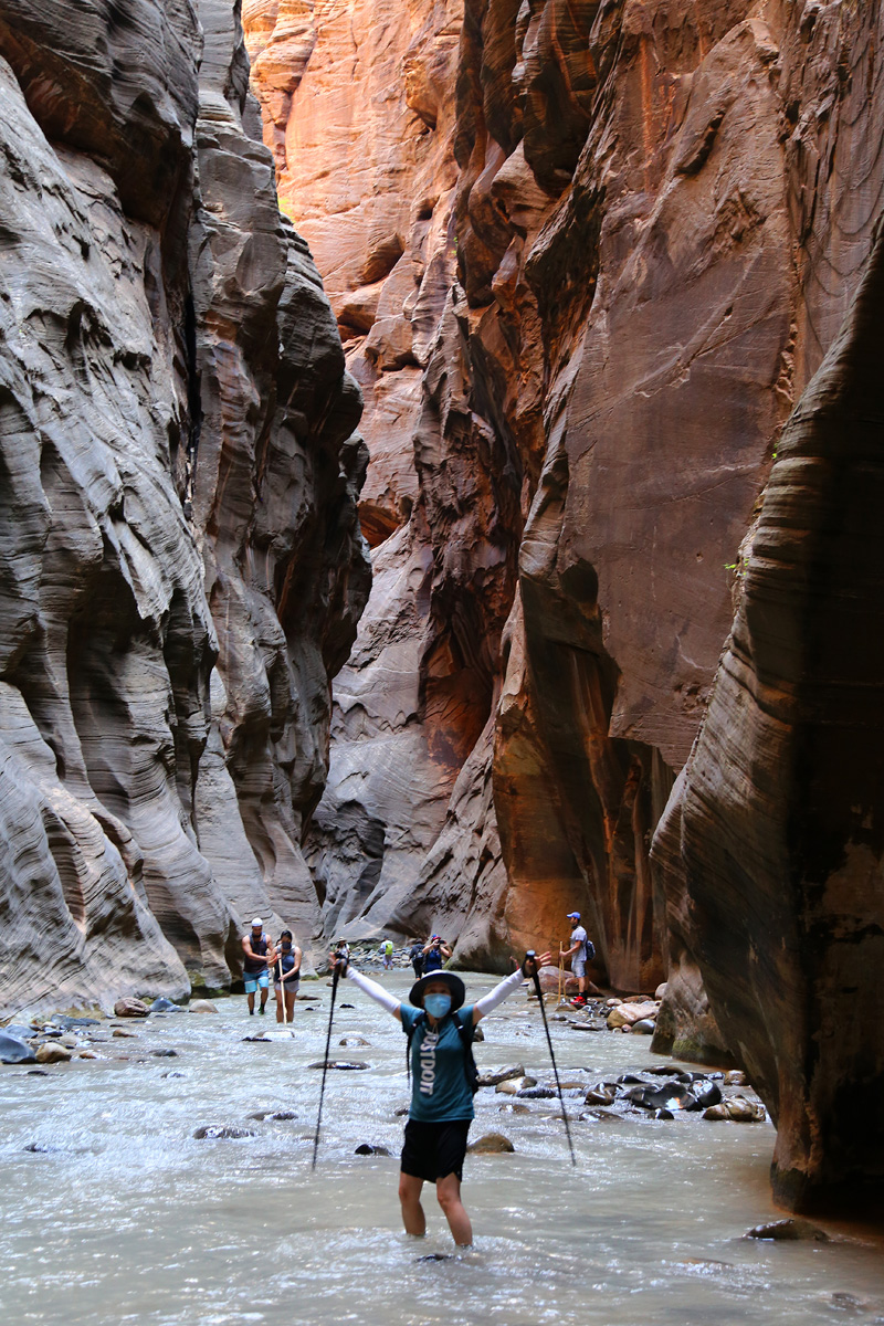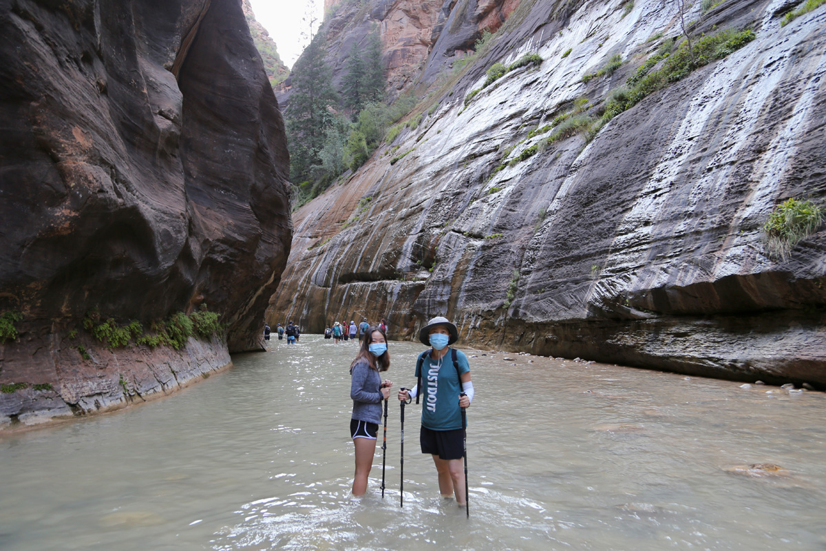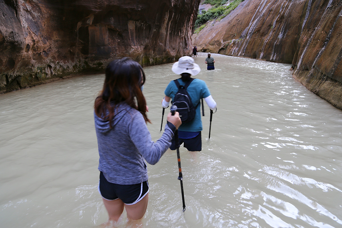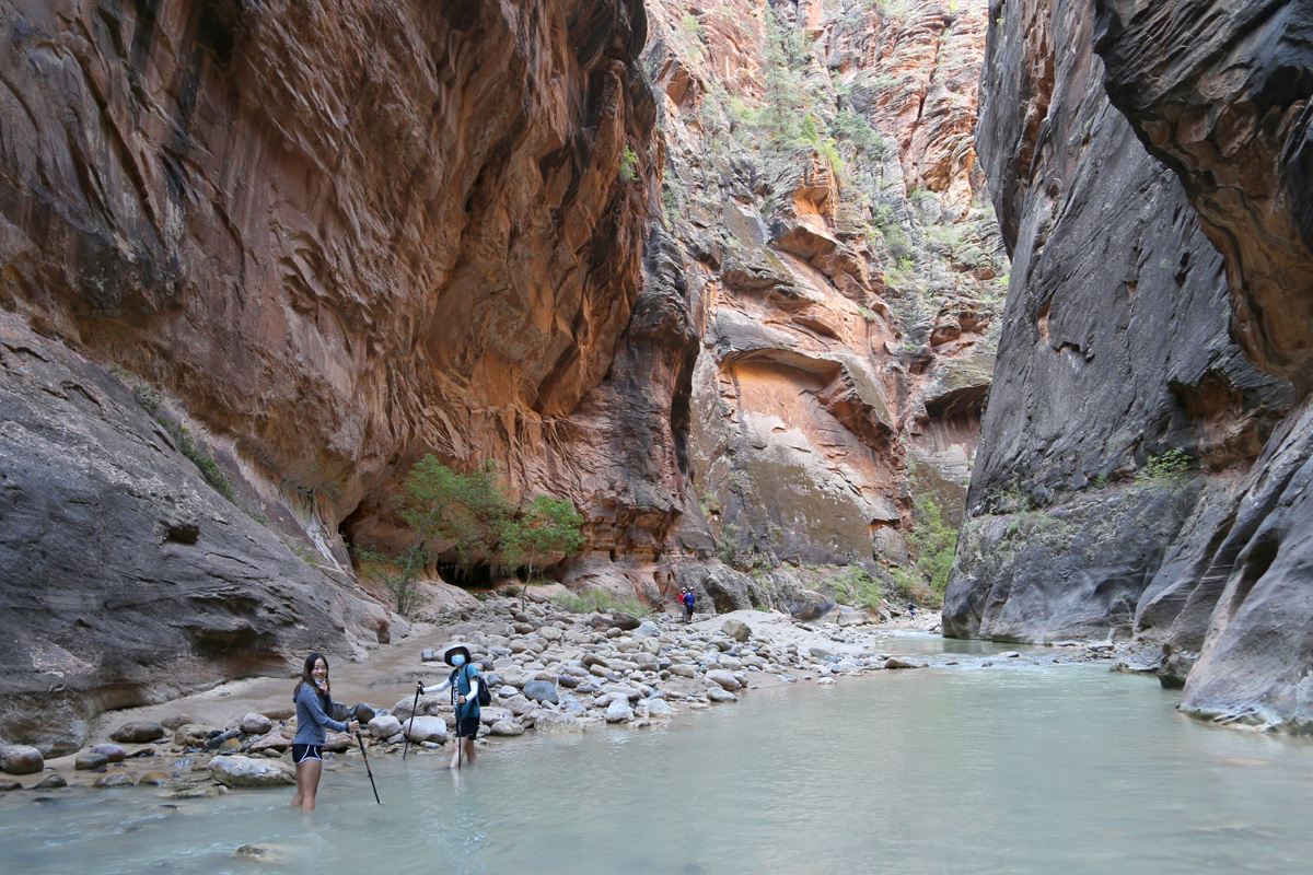 강물 속으로 들어가면서, 우리 가족 3명이 모두 염원했던 자이언 내로우 트레일이 시작되었다! 왼편에 보이는 사람들처럼 특수신발에 기다란 나무막대기를 빌려서 하이킹을 하시는 분들이 굉장히 많았는데, 우리는 그냥 신던 하이킹 신발과 스틱을 그대로 사용했다. 중요한 것은 발톱이 노출된 스포츠샌달이나 얇은 아쿠아슈즈 등의 신발을 신고는 절대로 내로우 하이킹을 하면 안 된다는 것이다.