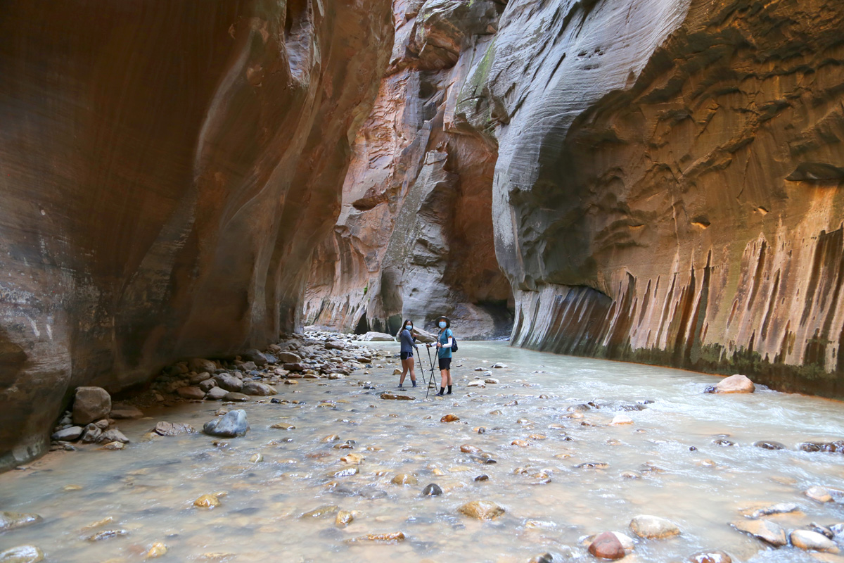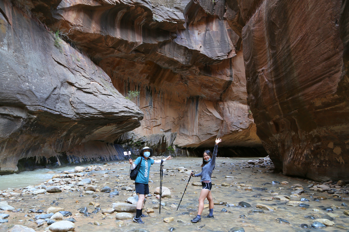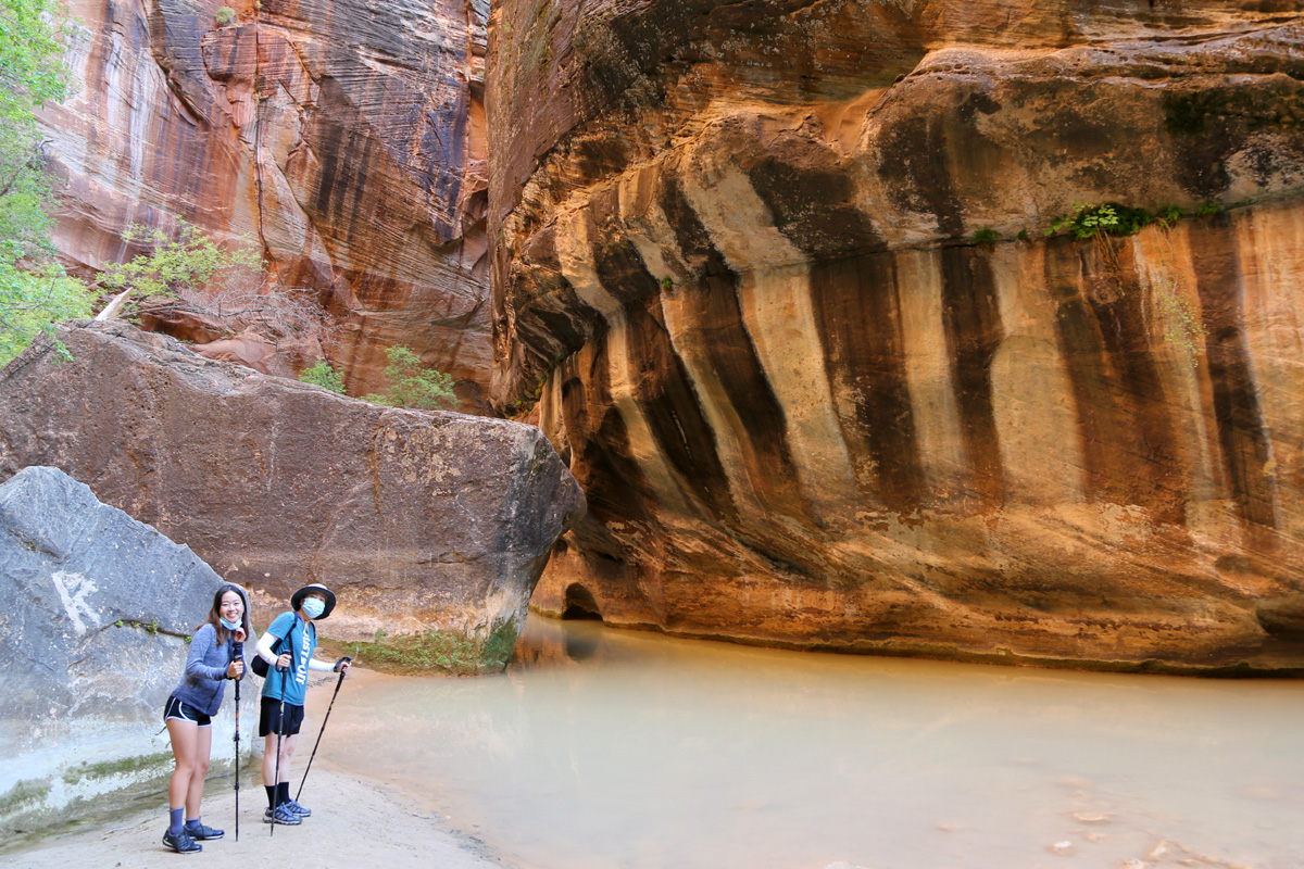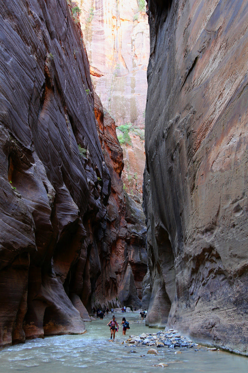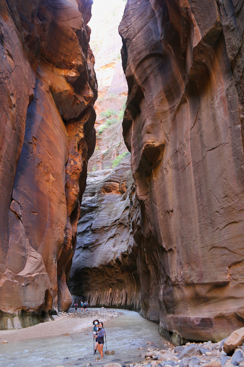 강물 속으로 들어가면서, 우리 가족 3명이 모두 염원했던 자이언 내로우 트레일이 시작되었다! 왼편에 보이는 사람들처럼 특수신발에 기다란 나무막대기를 빌려서 하이킹을 하시는 분들이 굉장히 많았는데, 우리는 그냥 신던 하이킹 신발과 스틱을 그대로 사용했다. 중요한 것은 발톱이 노출된 스포츠샌달이나 얇은 아쿠아슈즈 등의 신발을 신고는 절대로 내로우 하이킹을 하면 안 된다는 것이다.