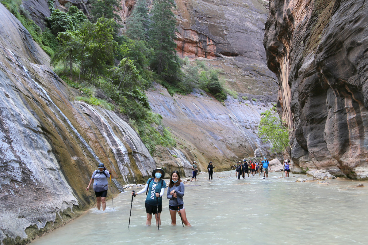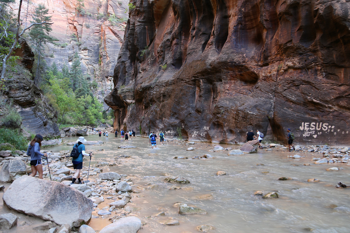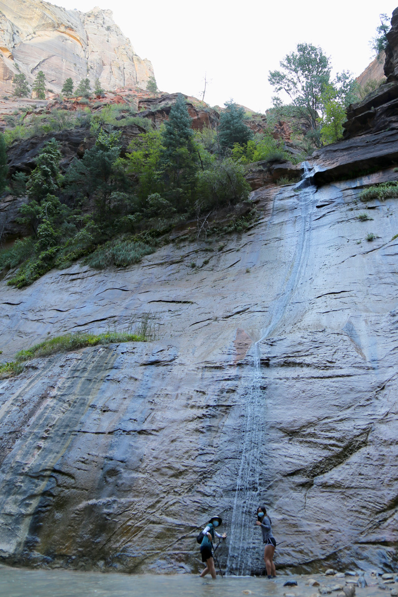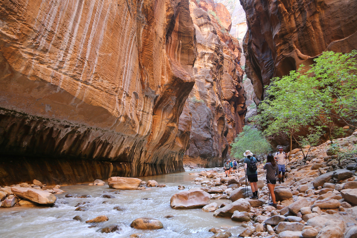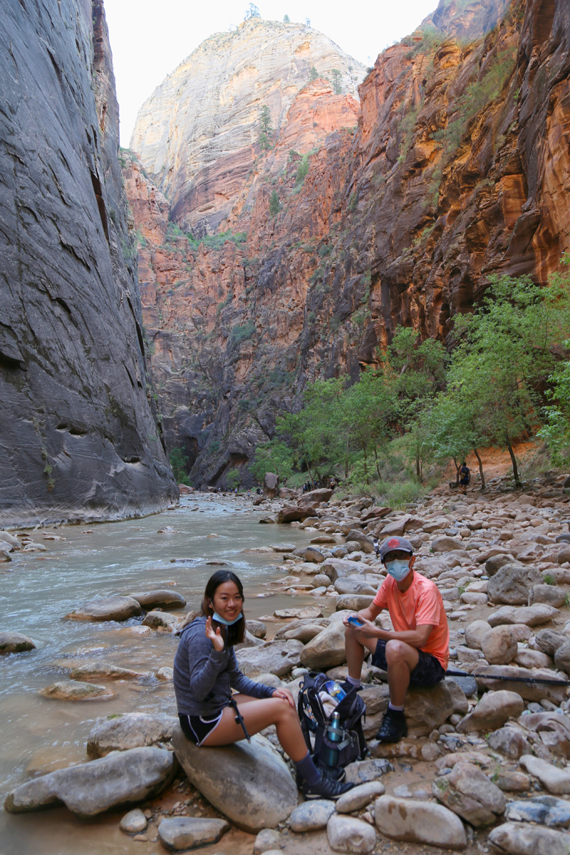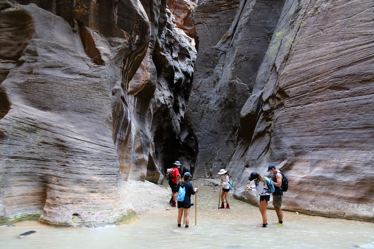 강물 속으로 들어가면서, 우리 가족 3명이 모두 염원했던 자이언 내로우 트레일이 시작되었다! 왼편에 보이는 사람들처럼 특수신발에 기다란 나무막대기를 빌려서 하이킹을 하시는 분들이 굉장히 많았는데, 우리는 그냥 신던 하이킹 신발과 스틱을 그대로 사용했다. 중요한 것은 발톱이 노출된 스포츠샌달이나 얇은 아쿠아슈즈 등의 신발을 신고는 절대로 내로우 하이킹을 하면 안 된다는 것이다.