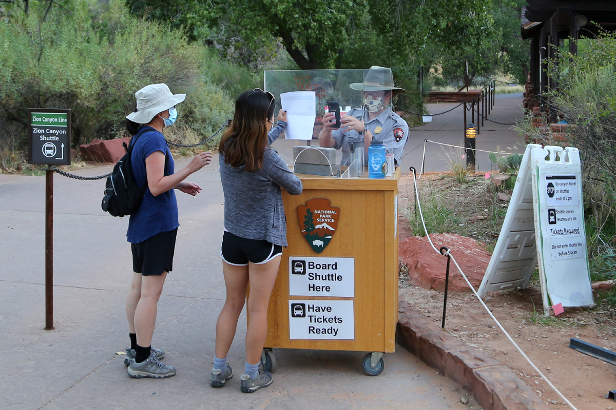 인터넷으로 미리 1인당 1달러를 내고 아침 7시~8시 사이로 예매한 셔틀버스 승차권을 확인하는 모습인데, 현재 자이언 국립공원은 코로나 팬데믹으로 인해서 이렇게 계곡 안으로 들어가는 셔틀버스 승차권을 미리 예매해야만 탑승할 수 있으니까 방문하실 분들은 참고하시기 바란다.