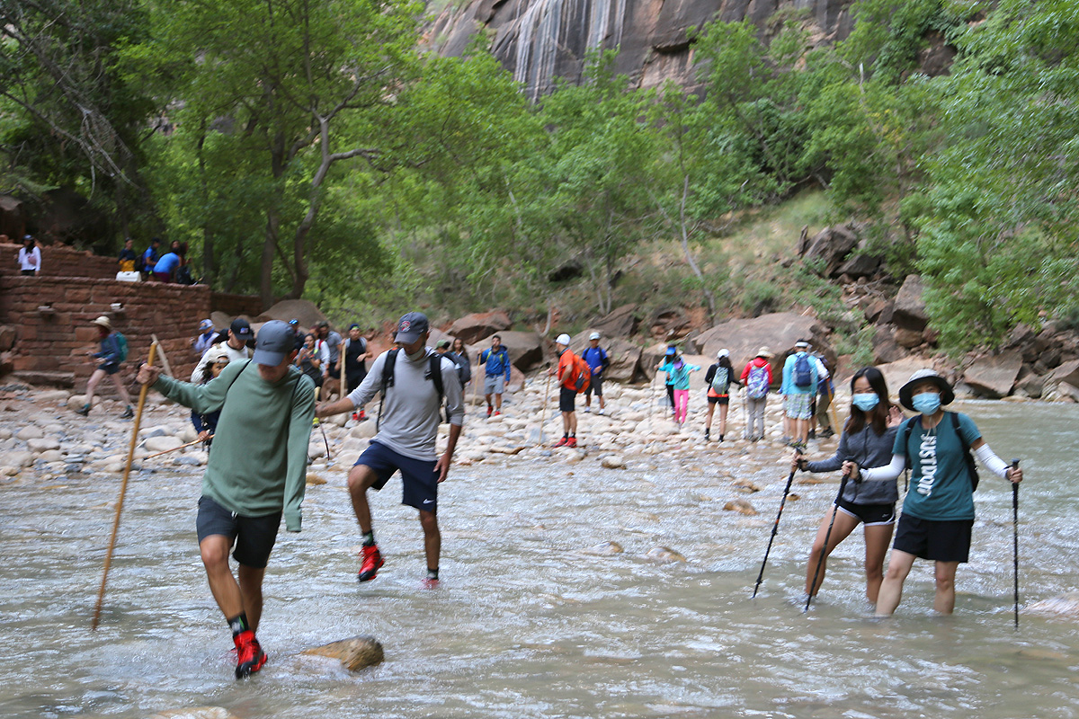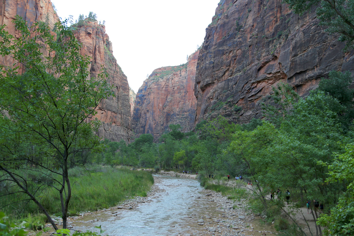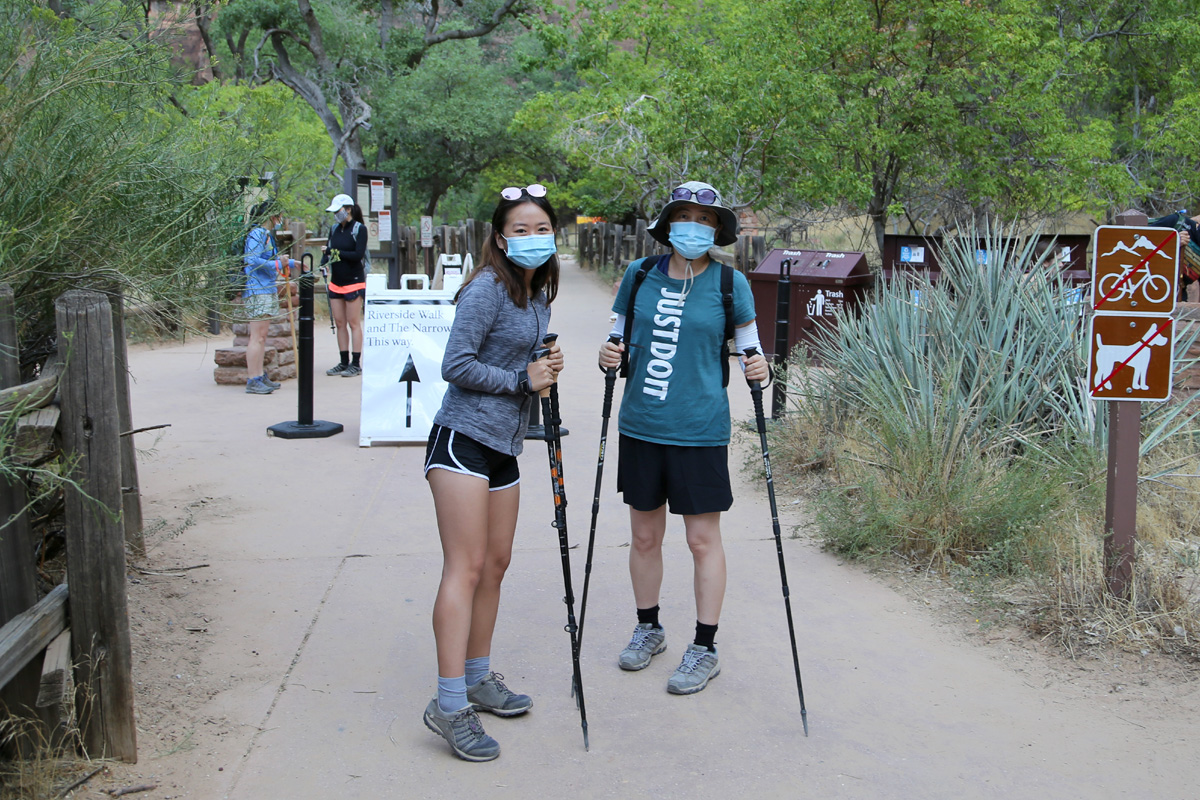 자이언 국립공원 협곡의 본류인 버진 강(Virgin River)을 따라 이른 아침에 리버사이드워크(Riverside Walk) 트레일을 걷고 있는 저 사람들은 모두 발을 물에 적실 준비를 하고 '더내로우스(The Narrows)'를 향하는 사람들이라 보면 된다.