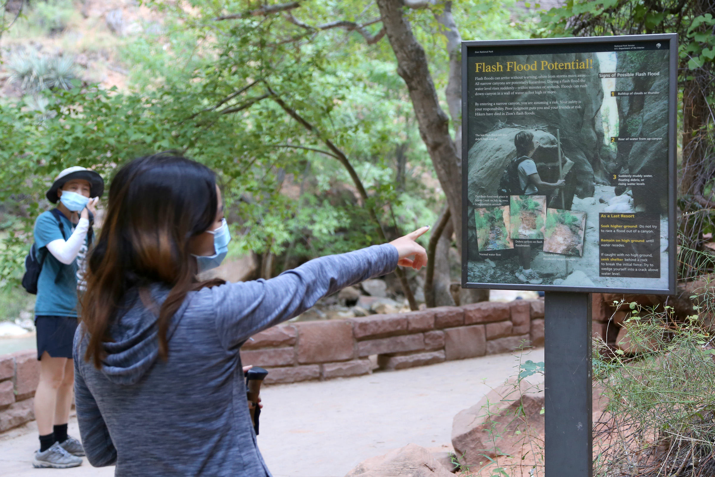 리버사이드워크가 끝나는 곳에 세워져 있던, 갑작스럽게 계곡의 물이 불어나는 플래시플러드(flash flood)의 위험성과 대처요령을 알려주는 안내판이다. (클릭해서 원본보기를 하시면 직접 읽으실 수 있음) 그리고는 신발끈을 조여매고...