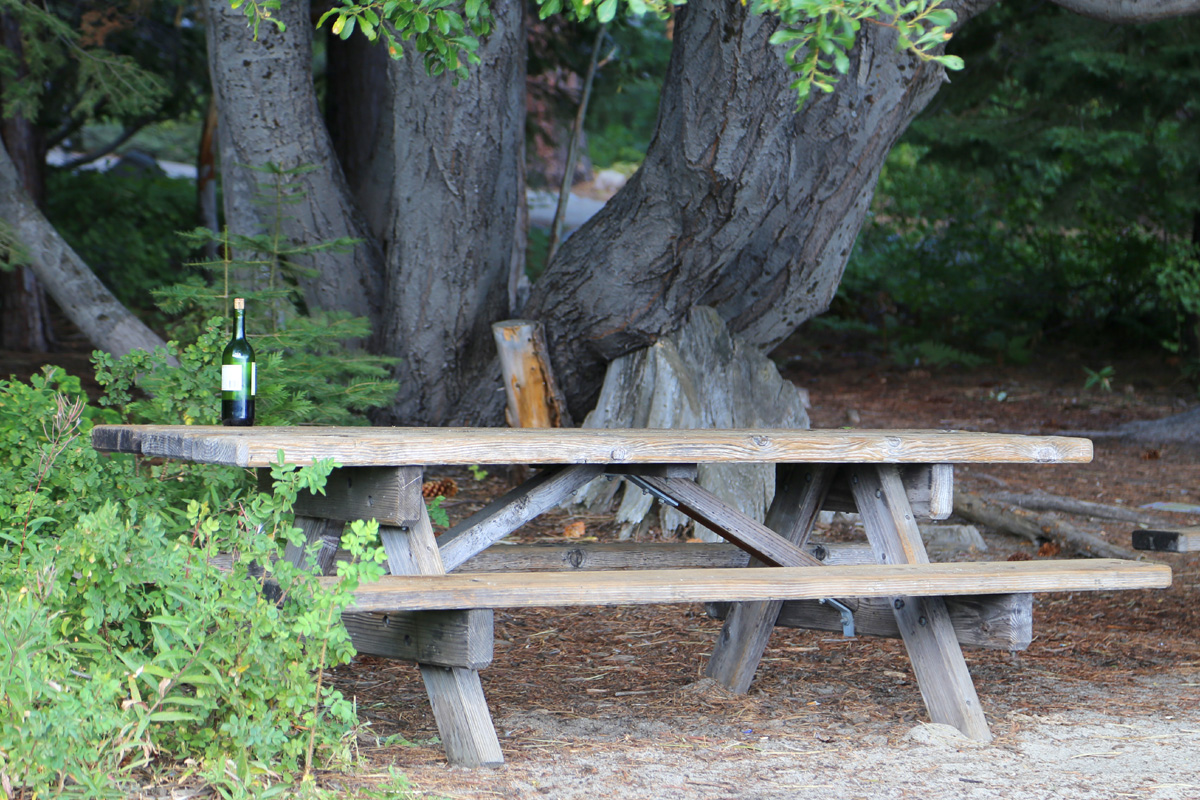 호숫가 고목 아래에 만들어진 피크닉테이블 위에는 누군가 마시다 만 와인병이 하나 놓여 있었고,