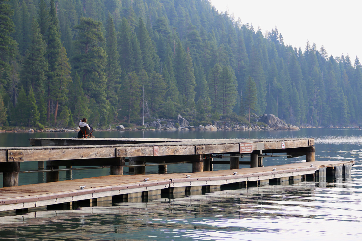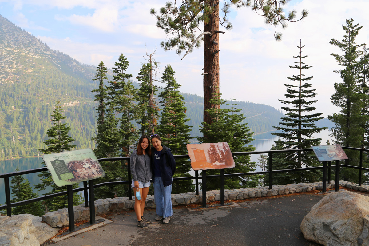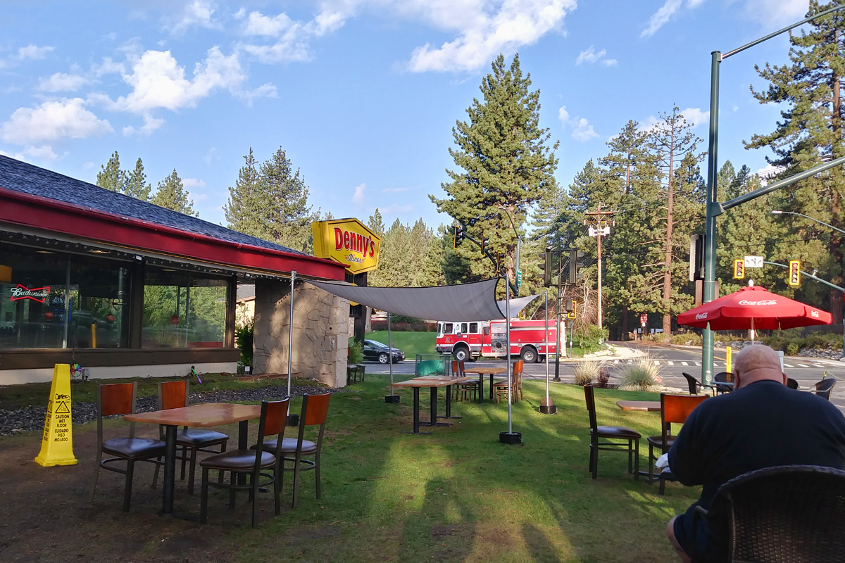 전날 일요일 오후에 도착했을 때는 자욱한 산불연기 때문에 또 숙소도 마음에 들지 않아서 힘들었지만, 밤 사이에 비가 좀 내려 공기가 맑아져서 정말 다행이었다. 눈 뜨자마자 숙소 체크아웃을 하고 전날 봐뒀던 데니스(Denny's)에서 코로나 시대의 '아웃도어다이닝(outdoor dinning)'으로 잔디밭 테이블에서 아침을 맛있게 먹고는, 89번 Emerald Bay Rd를 따라서 주립공원으로 향했다.