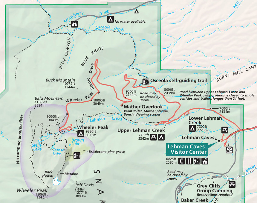 블로그에 처음 소개하는 국립공원이므로 지도를 오래간만에 올려본다. 공원의 위쪽 약 1/4만 잘라낸 것으로 대부분의 볼거리는 여기 모두 있는데, 이 지역을 빼고는 공원 제일 남쪽에 있는 미국 최대의 석회암 아치라는 렉싱턴아치(Lexington Arch)가 유명하다. (어차피 진입로가 4WD용 비포장이라서 가볼 수 없었음) 캠핑장에서 아점을 해먹고는 다시 차에 올라서 정확히 해발 1만피트, 무려 3049m의 도로끝까지 올라갔다.