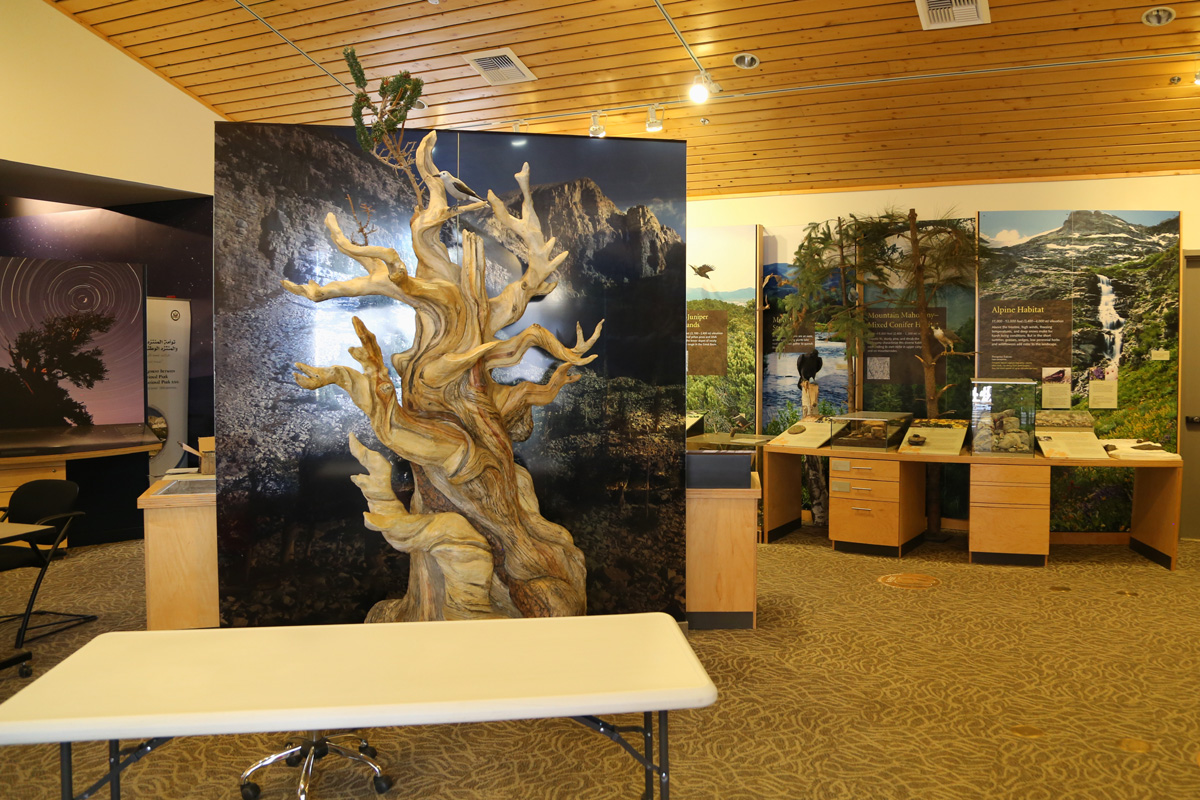 비지터센터 내부의 전시는 코로나 때문에 안쪽으로 들어가서 볼 수는 없었다... 다음편에 소개할 브리슬콘파인 나무가 앞쪽에 있고, 뒤에 '대분지(Great Basin)'에 대한 설명이 있다. 네바다 주의 대부분과 유타 주의 서쪽, 오레곤 주의 동남쪽, 그리고 데스밸리를 포함한 캘리포니아의 동쪽은 강물이 바다로 흘러가지 못하고 낮은 곳에 모여서 증발해버리는 내륙유역(endorheic basin)으로 그 전체가 하나의 거대한 분지이다.