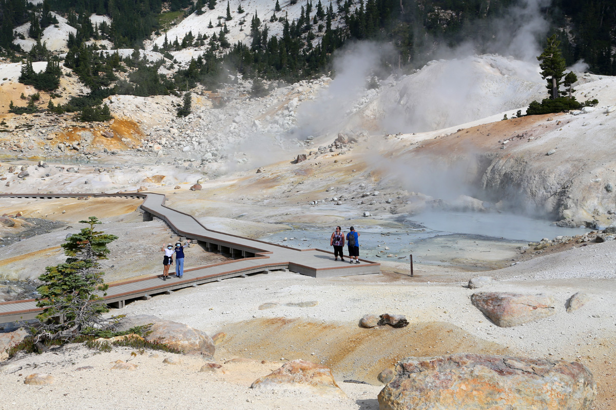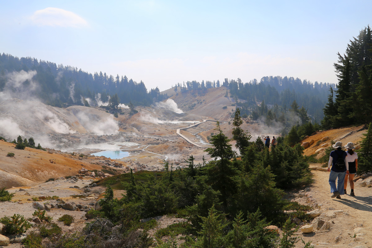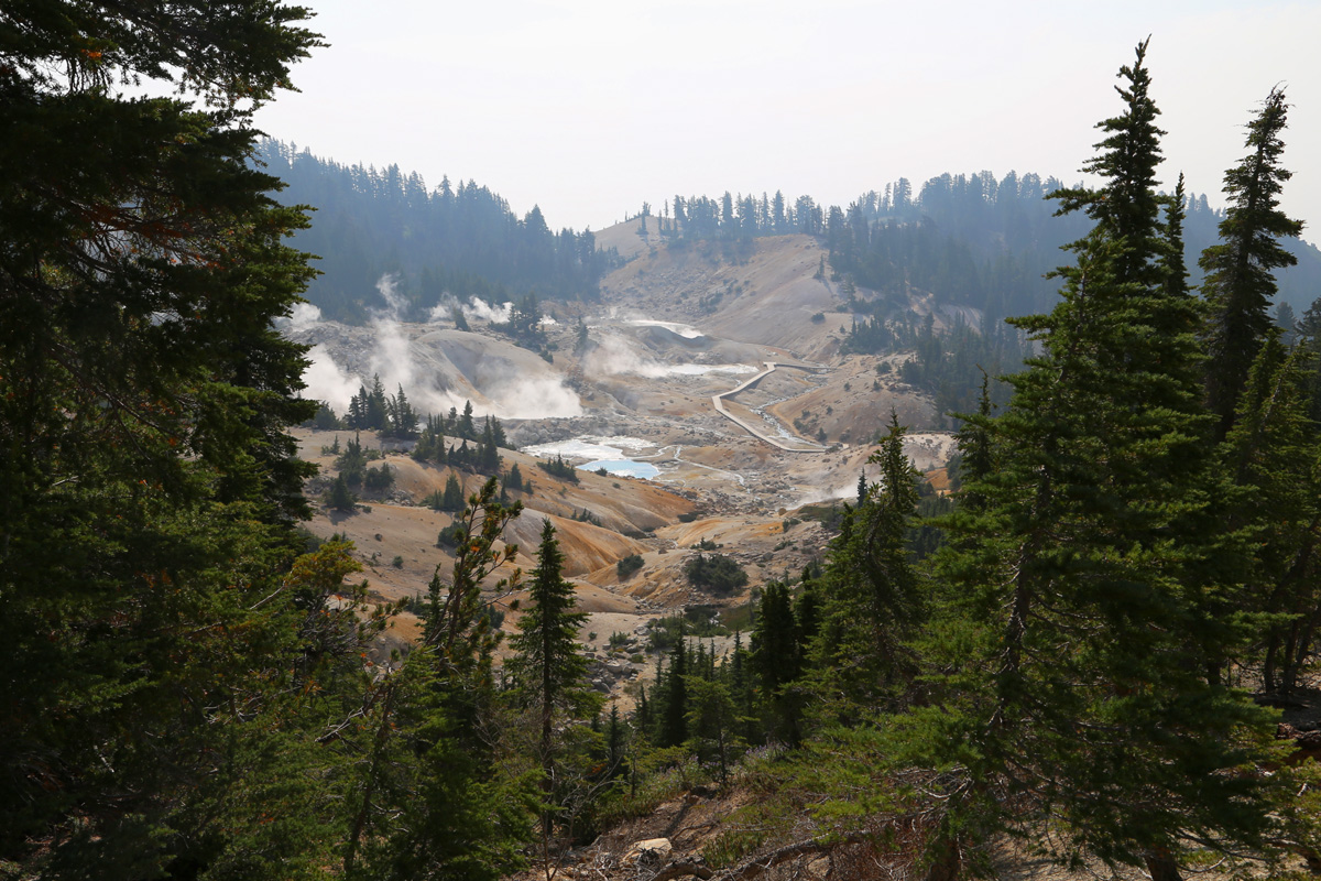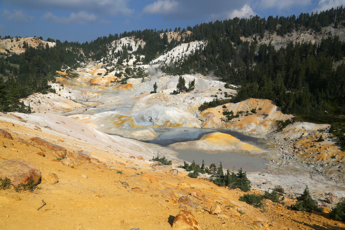 곳곳에서 연기가 피어오르는 이 분지는 래슨볼캐닉 국립공원에서 가장 넓은 열수지역(hydrothermal area)으로 소위 '캘리포니아의 옐로우스톤'이라 불리는 곳이다. (구글맵으로 위치를 보시려면 여기를 클릭)