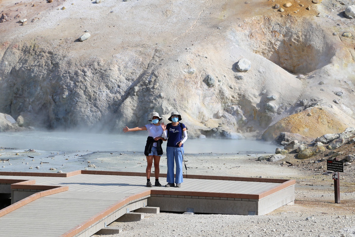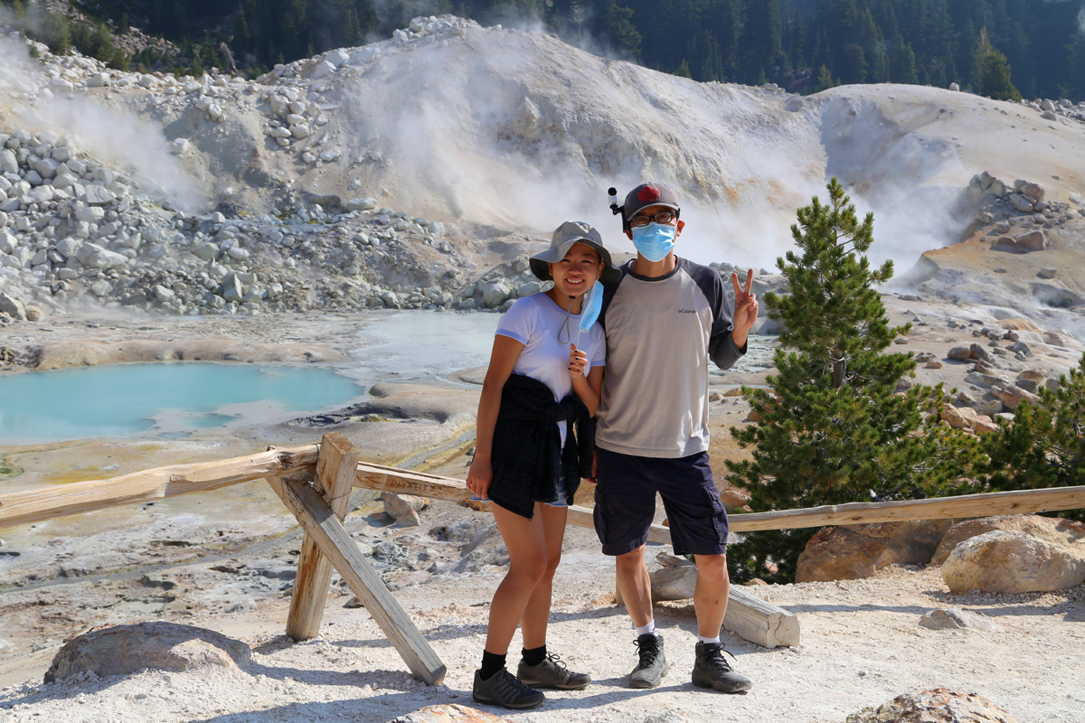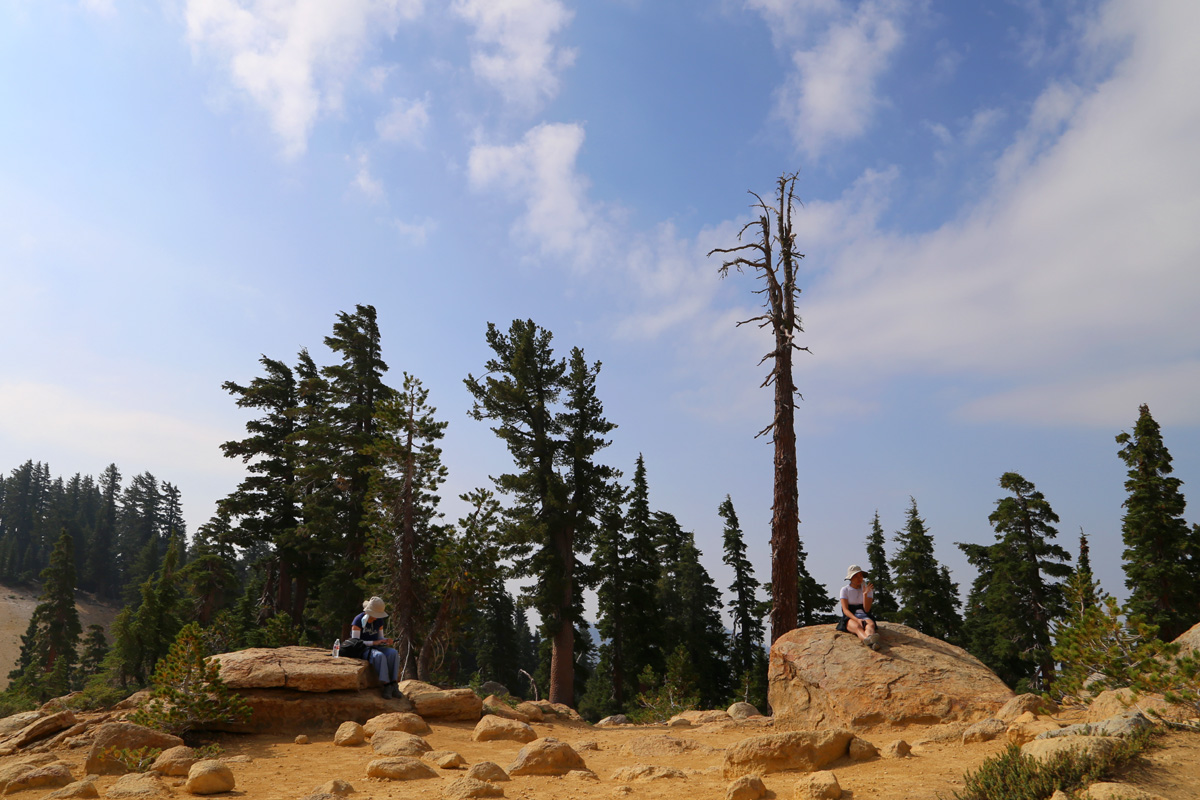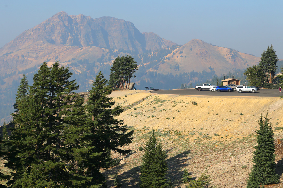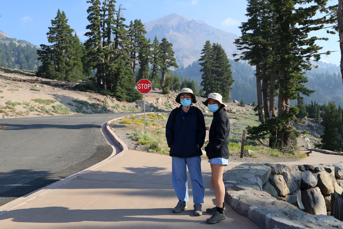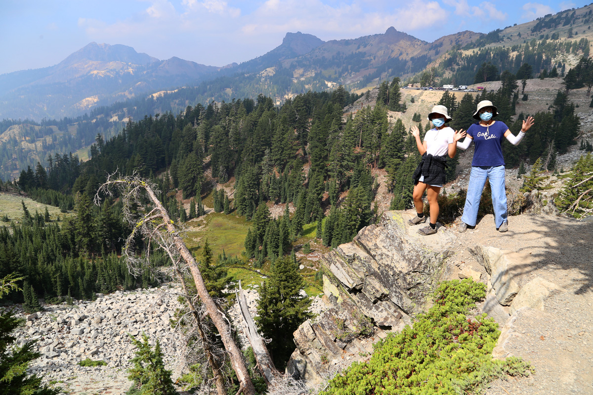 범패스헬 트레일을 시작하는 곳은 주차장의 동쪽 끝에 있었는데, 마스크를 쓴 모녀의 뒤로 이 국립공원에서 제일 높은 봉우리인 해발 3,187 m의 래슨피크(Lassen Peak)가 보인다.