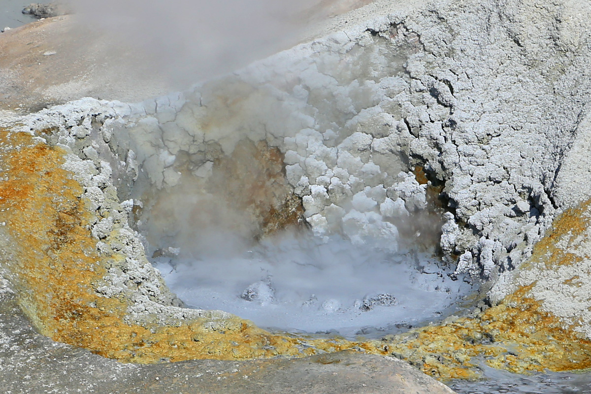 나무 사이로 이런 풍경이 보이면 '범패스의 지옥(Bumpass's Hell)'에 도착을 한 것이다. 1864년에 Kendall Vanhook Bumpass가 이 곳을 처음 발견해서 직접 관광지로 개발을 하려다가, 땅이 꺼지면서 펄펄 끓는 진흙에 빠져 한 쪽 다리를 잃었다고 한다. 역시 지옥(Hell)이 땅 아래에 있다고 생각하는 것은 동서양이 같은 듯...