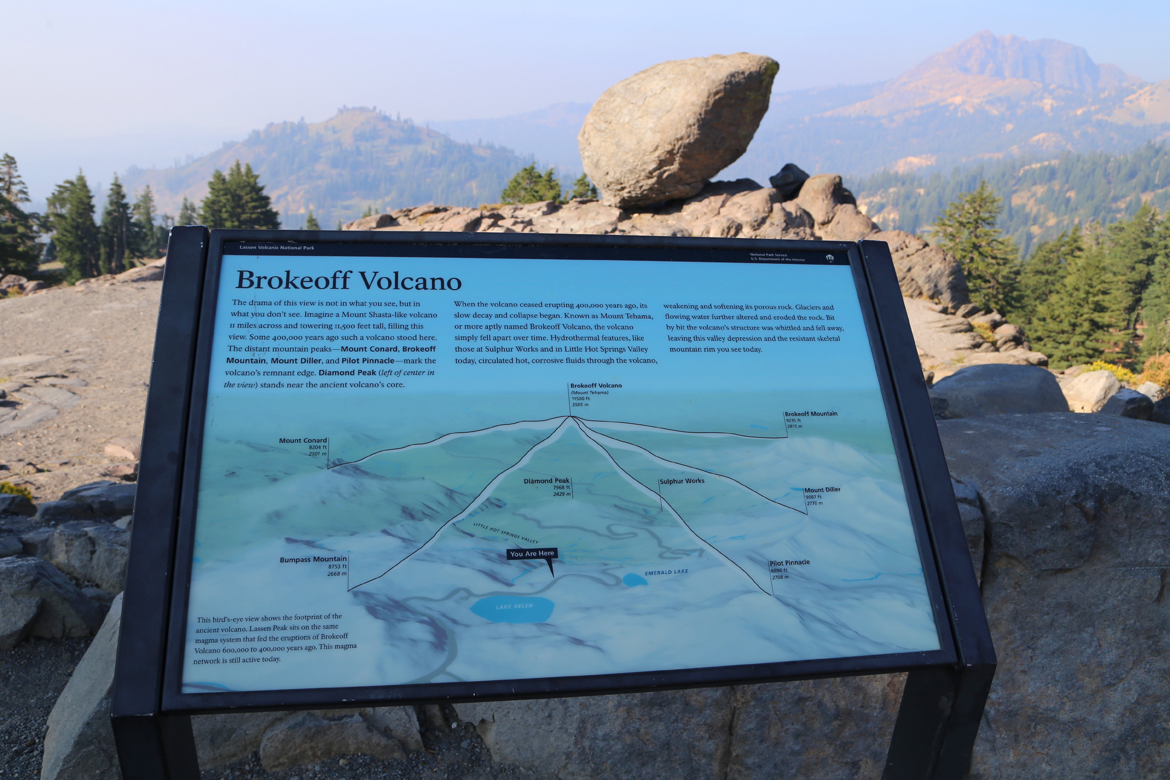 전편에서 소개한 이 국립공원 간판을 보면 점선으로 그려진 산이 있는데 (보시려면 클릭), 약 40만년 전까지는 왼편에 보이는 Diamond Peak의 위쪽으로 1 km 이상을 더 솟아있던 화산인 마운트테하마(Mount Tehama)가 있었다고 한다. 그런데 모두 침식으로 깍여서 사라지고 남은 가장자리가 오른쪽에 멀리 보이는 바위절벽의 브로크오프산(Brokeoff Mountain)이라고 한다.