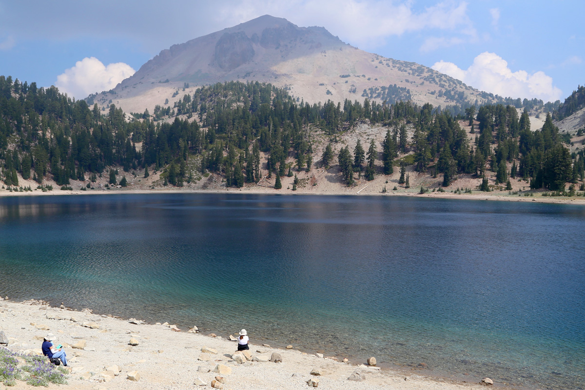 헬렌 호숫가에서 사모님은 스마트폰을 보시고, 지혜는 래슨 봉우리를 바라고보 있다. "지혜야, 우리 저기 올라가보지 않을래?"