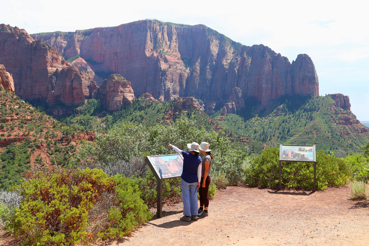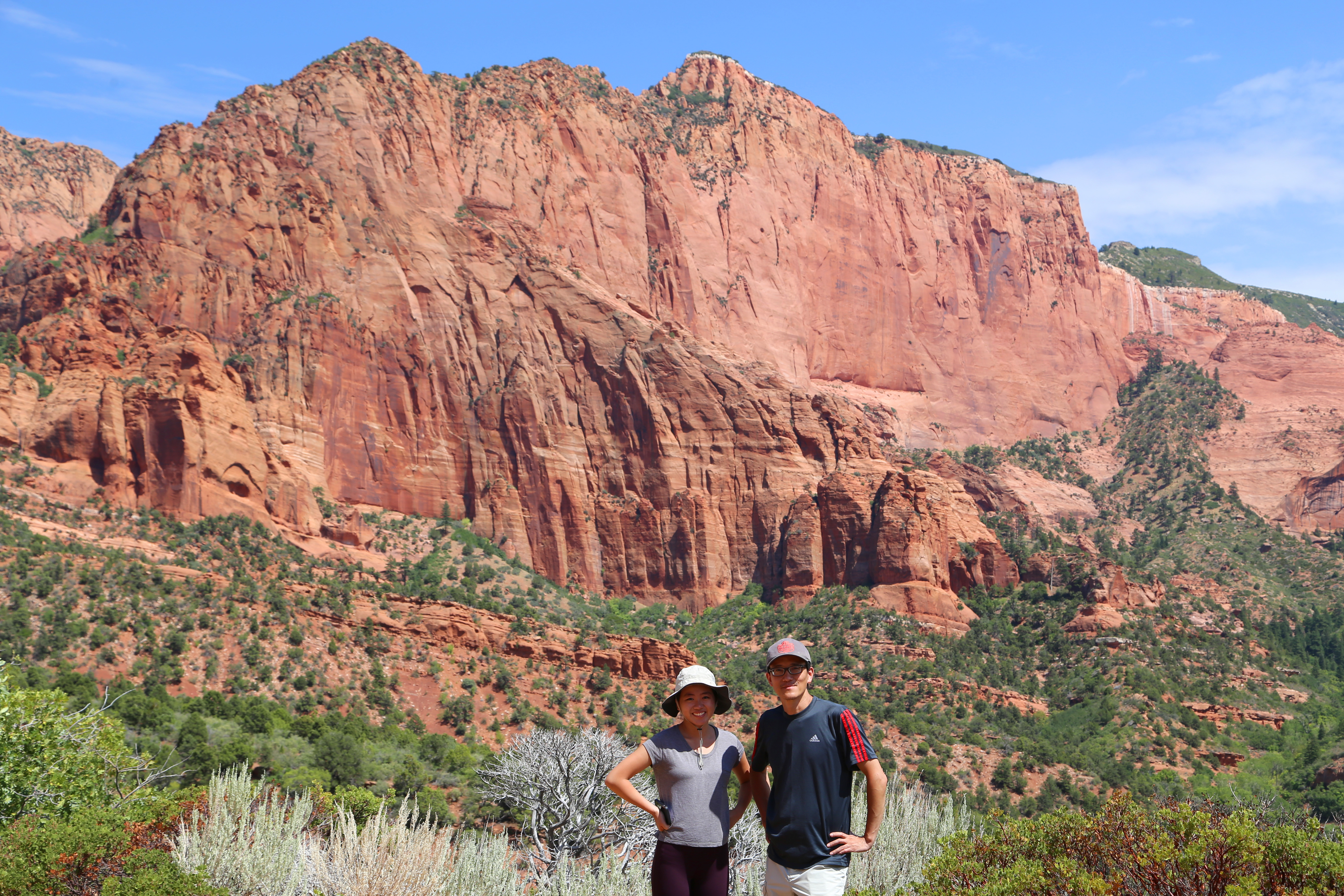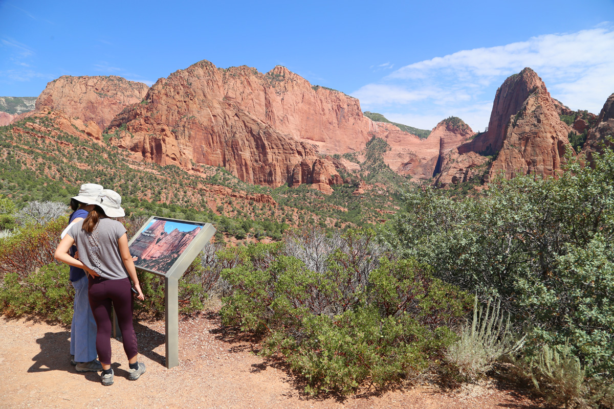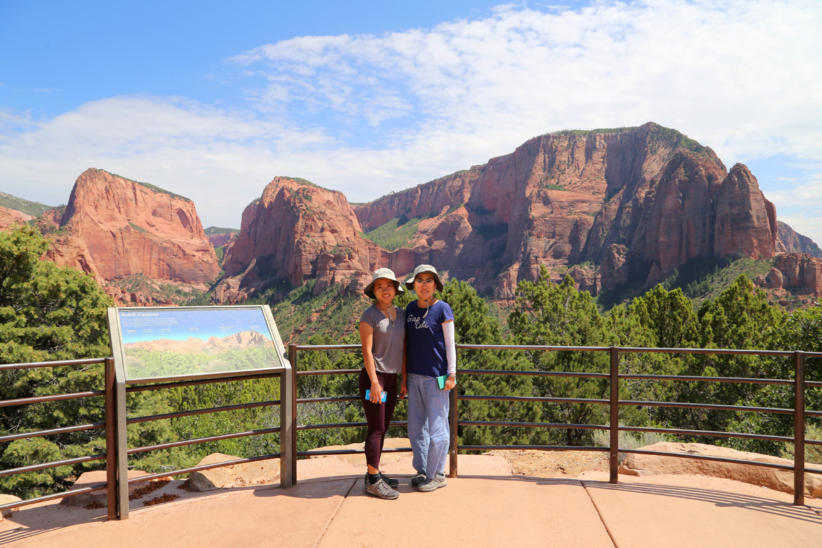 콜롭캐년 전망대(Kolob Canyons Viewpoint)에 내리면 제일 오른쪽 팀버탑(Timber Top) 등의 바위산들이 만드는 장관을 보실 수 있다. (구글맵으로 위치를 보시려면 여기를 클릭) 여기서 약간의 언덕을 올라 좀 더 높은 곳에서 풍경을 볼 수 있는 Timber Creek Overlook Trail을 할 수도 있다. 하지만 날씨가 더워서 우리는 하지 않았고, 대신에 운전해서 올 때 역광이라서 제대로 못 본 아래쪽 도로변으로 다시 내려갔다.