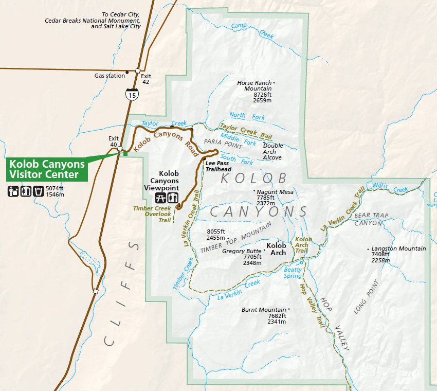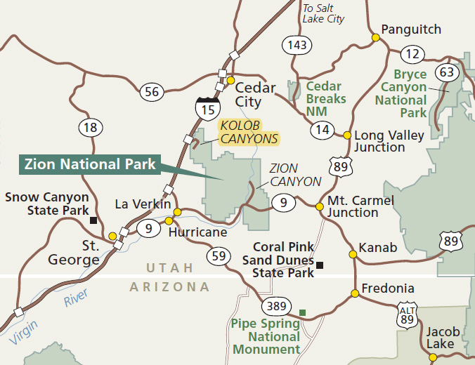 유타(Utah) 주의 자이언 국립공원(Zion National Park)과 그 주변을 보여주는 지도인데, 대부분의 관광객들이 찾는 유명한 곳은 9번 도로에서 들어가는 자이언캐년(Zion Canyon) 지역이다. 그런데 거기서 북서쪽에 15번 고속도로와 붙어있는 콜롭캐년(Kolob Canyons)이라 표시된 지역이 이제 소개하는 자이언의 '또 다른 협곡'이다.