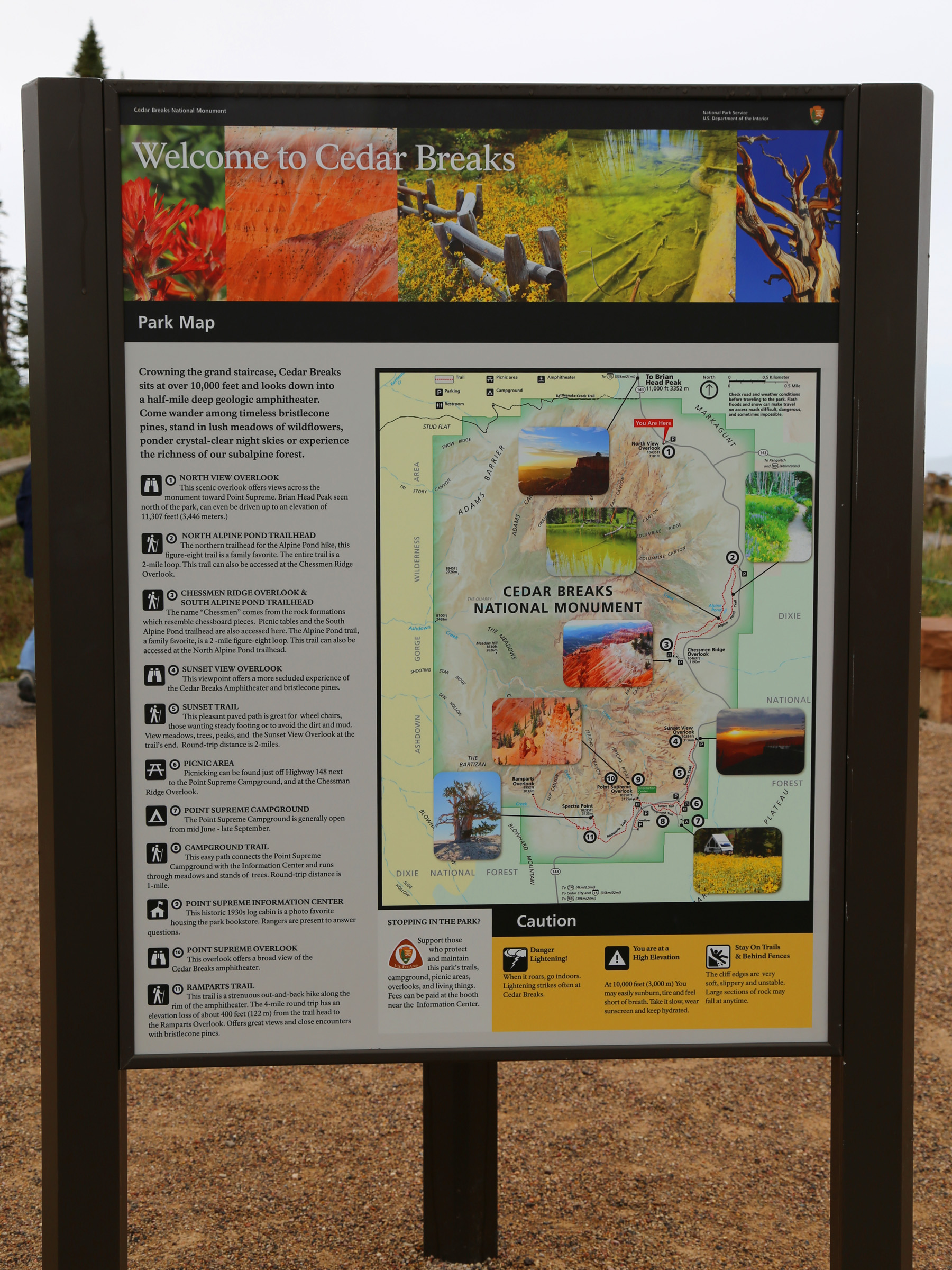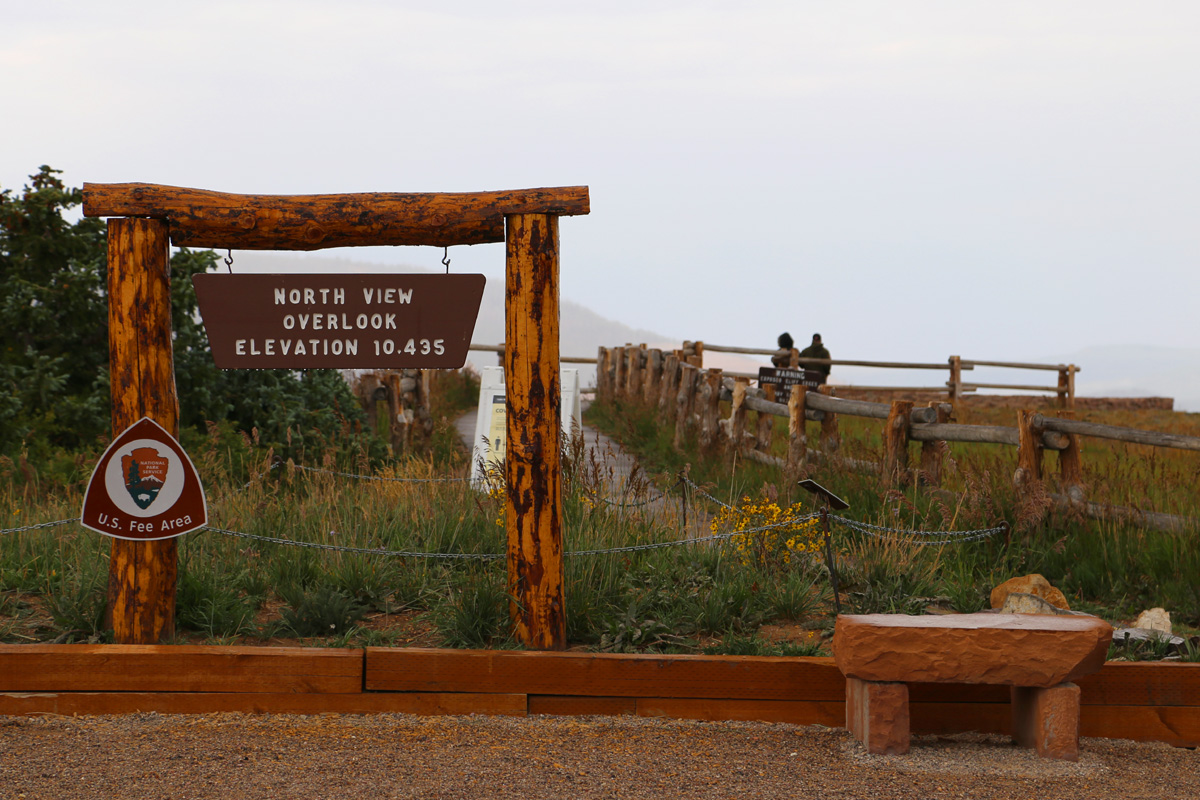 다행히 첫번째 노스뷰 전망대(North View Overlook)에 도착해서는 빗줄기가 좀 약해지기는 했지만, 해발 10,435피트(3,181 m)의 고지대라 기온까지 뚝 떨어져서 차 안에서 옷을 꺼내입고 저 끝의 전망대까지 걸어가야 했다.