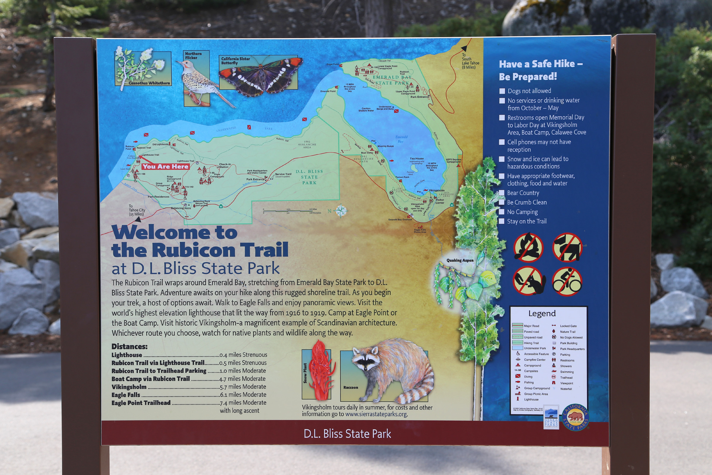 직원이 있는 게이트를 통과한 후, 울창한 소나무숲 속의 좁은 도로를 따라 여러 캠핑장을 지나서 끝까지 달리면 루비콘트레일(Rubicon Trail)의 출발점이 나온다. 타호 호숫가를 따라서 에머랄드베이(Emerald Bay) 주립공원의 이글포인트(Eagle Point)까지 편도 7.4마일의 산책로는 캘리포니아 최고의 트레일들 중의 하나로 항상 손꼽힌다.