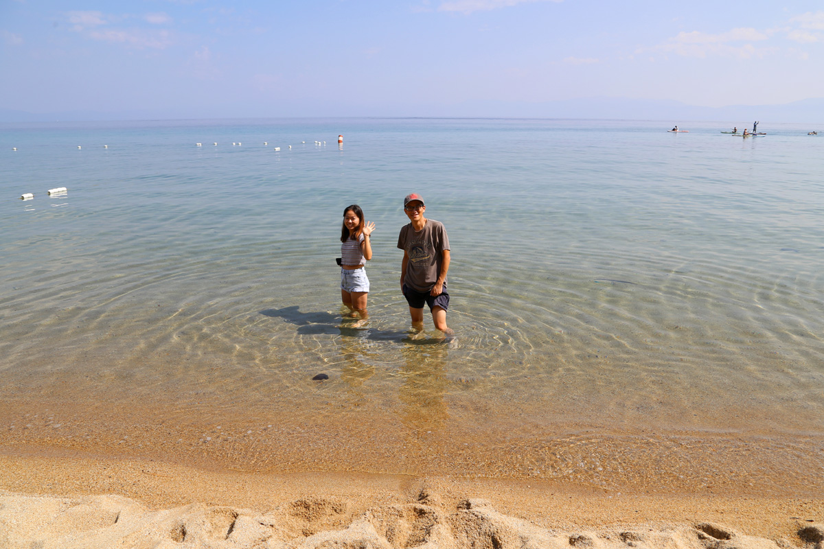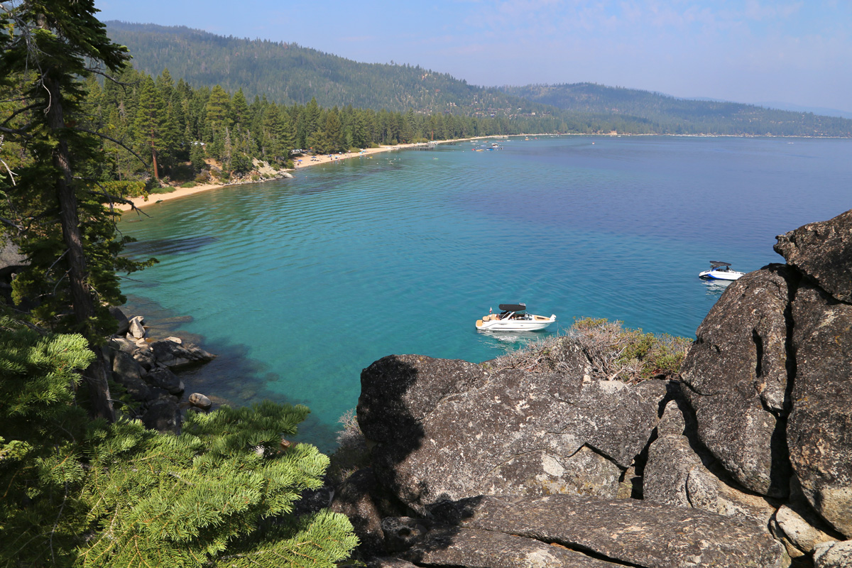모터보트, 패들보드, 카누, 튜브, 그리고 산불연기 때문에 저 멀리 뿌옇게 보이는 네바다 주의 산들... 이렇게 레이크타호 두번째 주립공원 구경을 마치고 모래가 묻은 발에 샌달을 신고 다시 호숫가를 따라서 북쪽으로 달렸다.