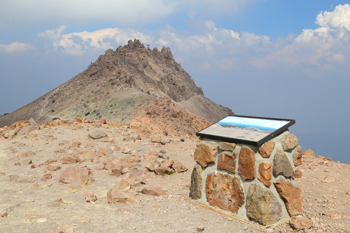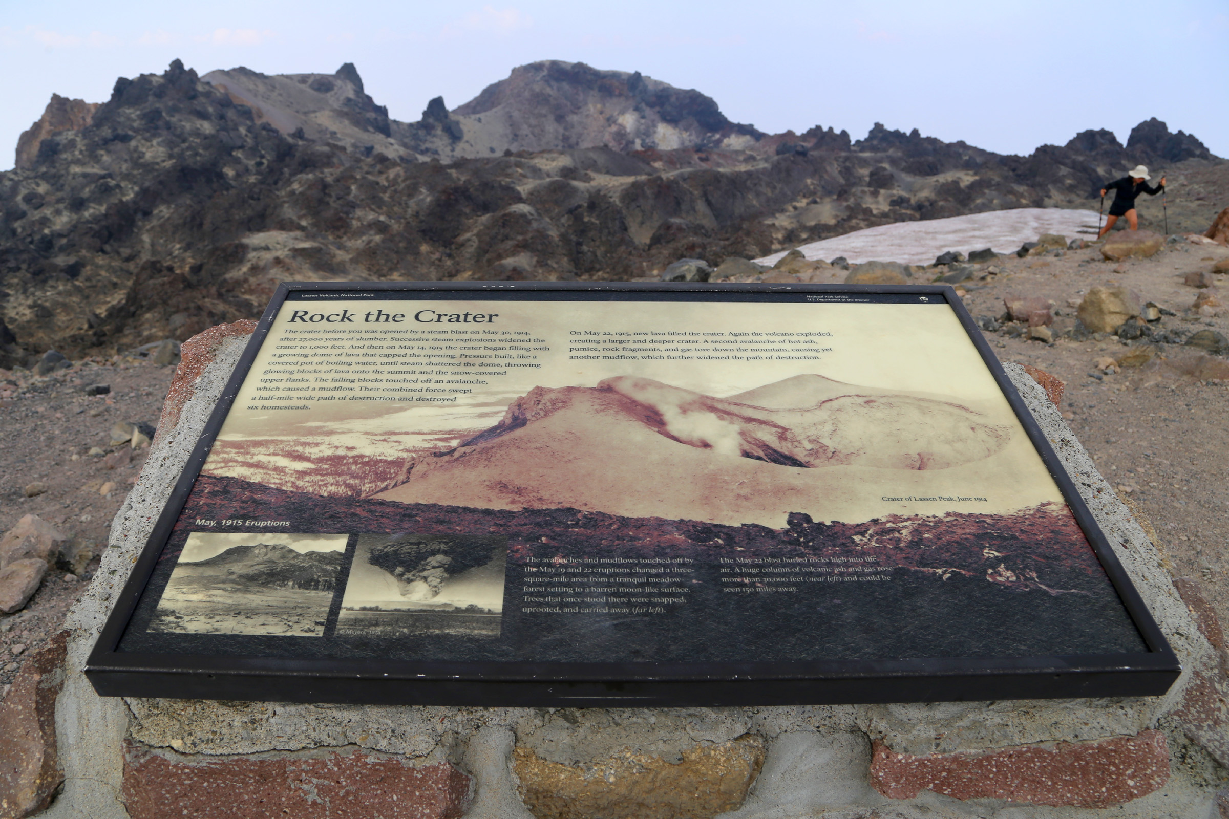 꼭대기 직전에는 많은 안내판들이 잘 만들어져 있는 넓은 언덕이 나온다. 저 안내판의 제목은 'Land of Volcanoes'로 여기 래슨볼캐닉 국립공원에는 형성된 방법에 따라 구분하는 4종류의 화산 - 쉴드(Shield), 신더콘(Cinder Cone), 콤포지트(Composite), 그리고 플러그돔(Plug Dome)이 모두 지척에 보인다는 것을 설명하고 있다.