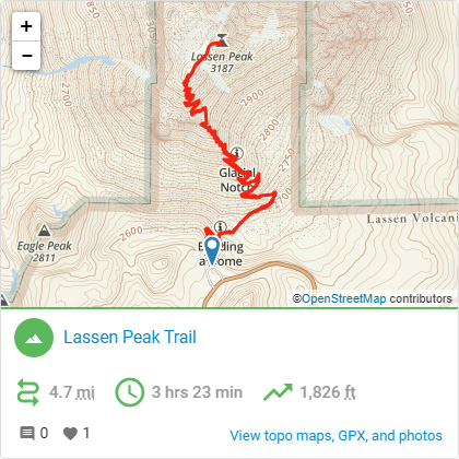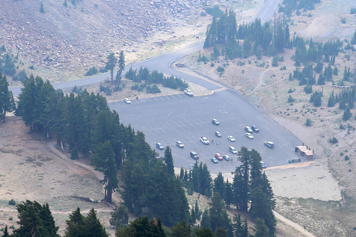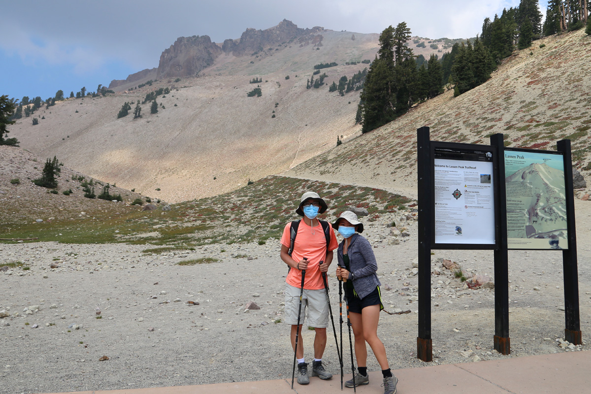 래슨볼캐닉 국립공원 캠핑여행의 2일째, 오전에 범패스헬(Bumpass Hell)을 구경하고 캠핑장으로 돌아가 점심을 먹은 후에 다시 고개를 넘어 Lassen Peak Trailhead 주차장으로 왔다. 안내판에는 여러 주의사항과 함께 여기 8500피트(2591 m) 주차장에서, 10457피트(3187 m) 정상까지 왕복 5마일로 4시간 정도가 소요된다고 안내되어 있다.