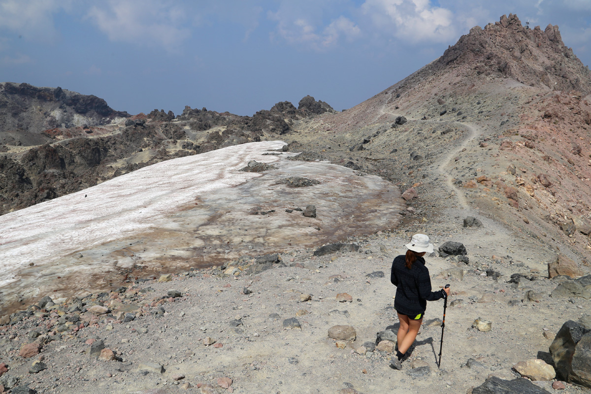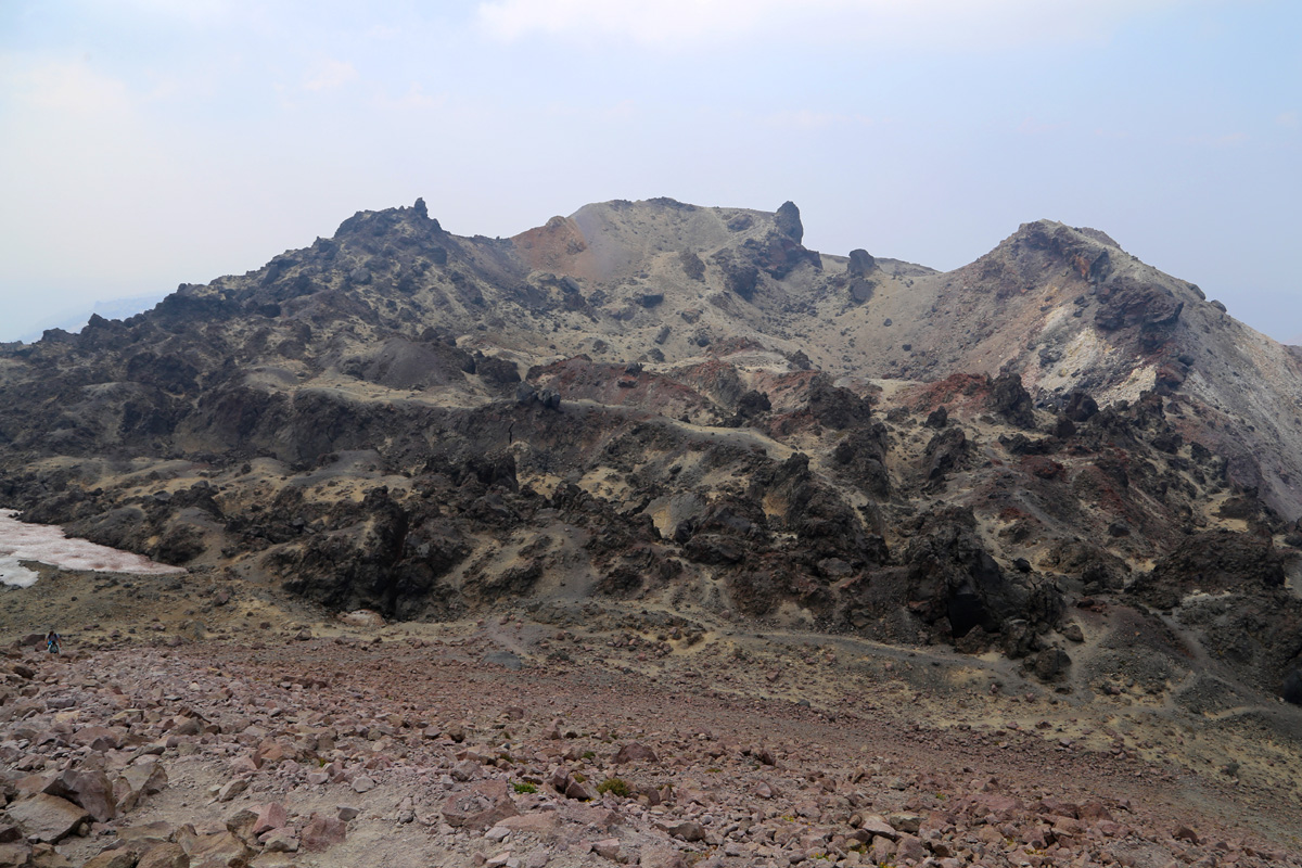 그 언덕에서 이 등산로의 유일한 내리막길을 잠시 내려간 후에, 오른편에 보이는 돌산의 뒤쪽으로 거의 기다시피 올라가면 정상에 도착한다. 왼편의 눈밭 너머로 거뭇한 바위들이 있는 곳이 분화구인데, 일단 정상부터 먼저 올라가보자~
