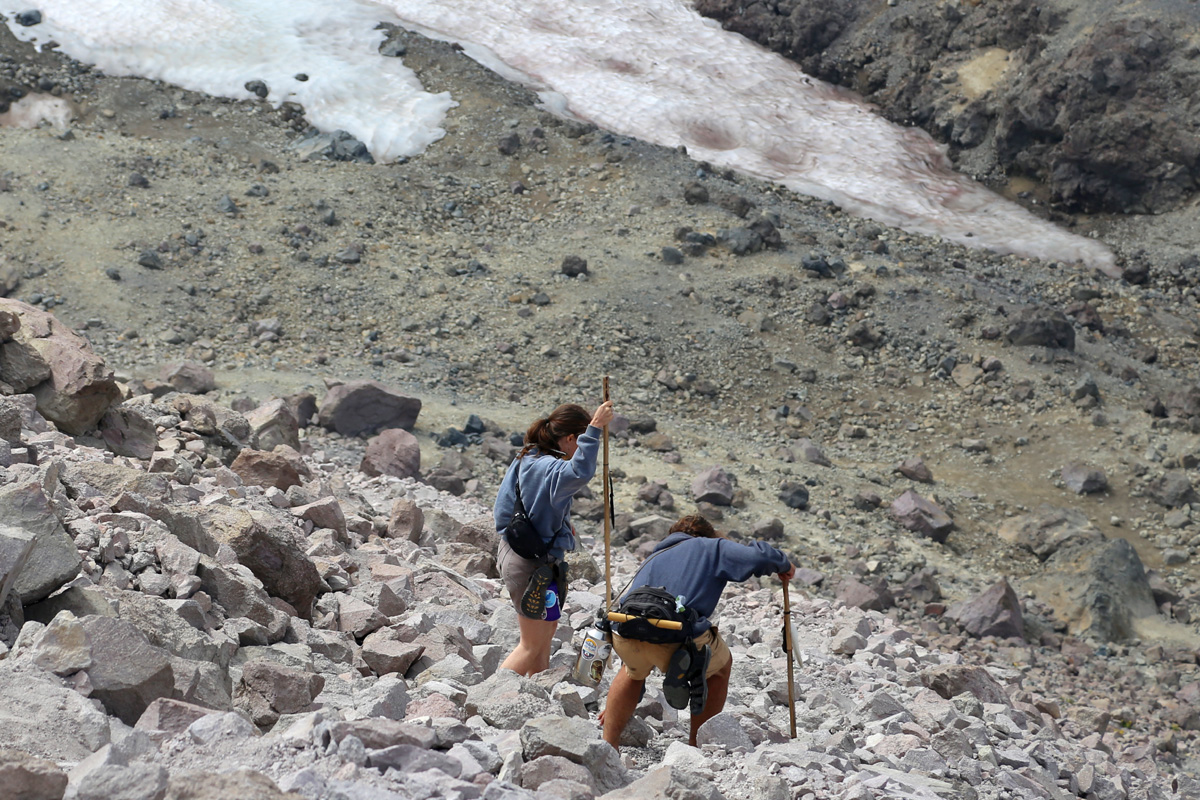원형극장처럼 파여져 있는 제일 아래에 정말 조금 남아있는 저 하얀 얼음이 이 곳을 깍아낸 빙하의 마지막 잔재이고, 그 뒤로 보이는 봉우리는 또 다른 플러그돔 화산인 리딩피크(Reading Peak)라고 한다.
