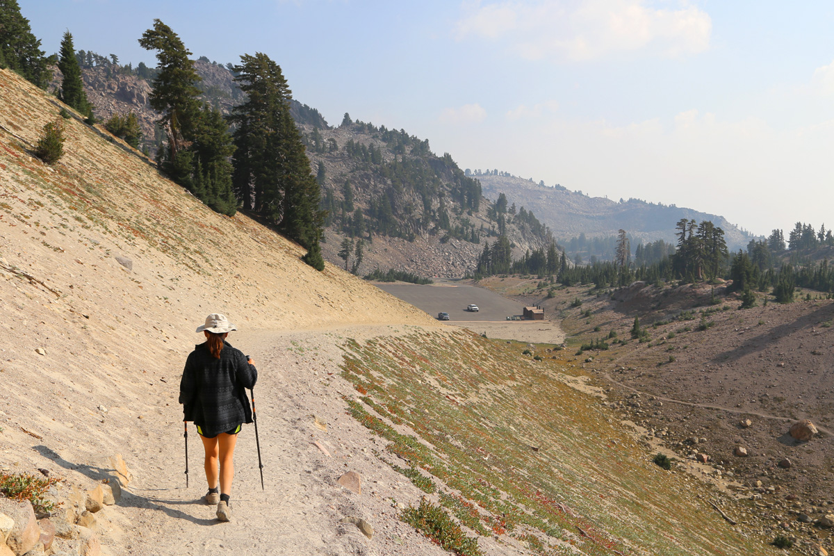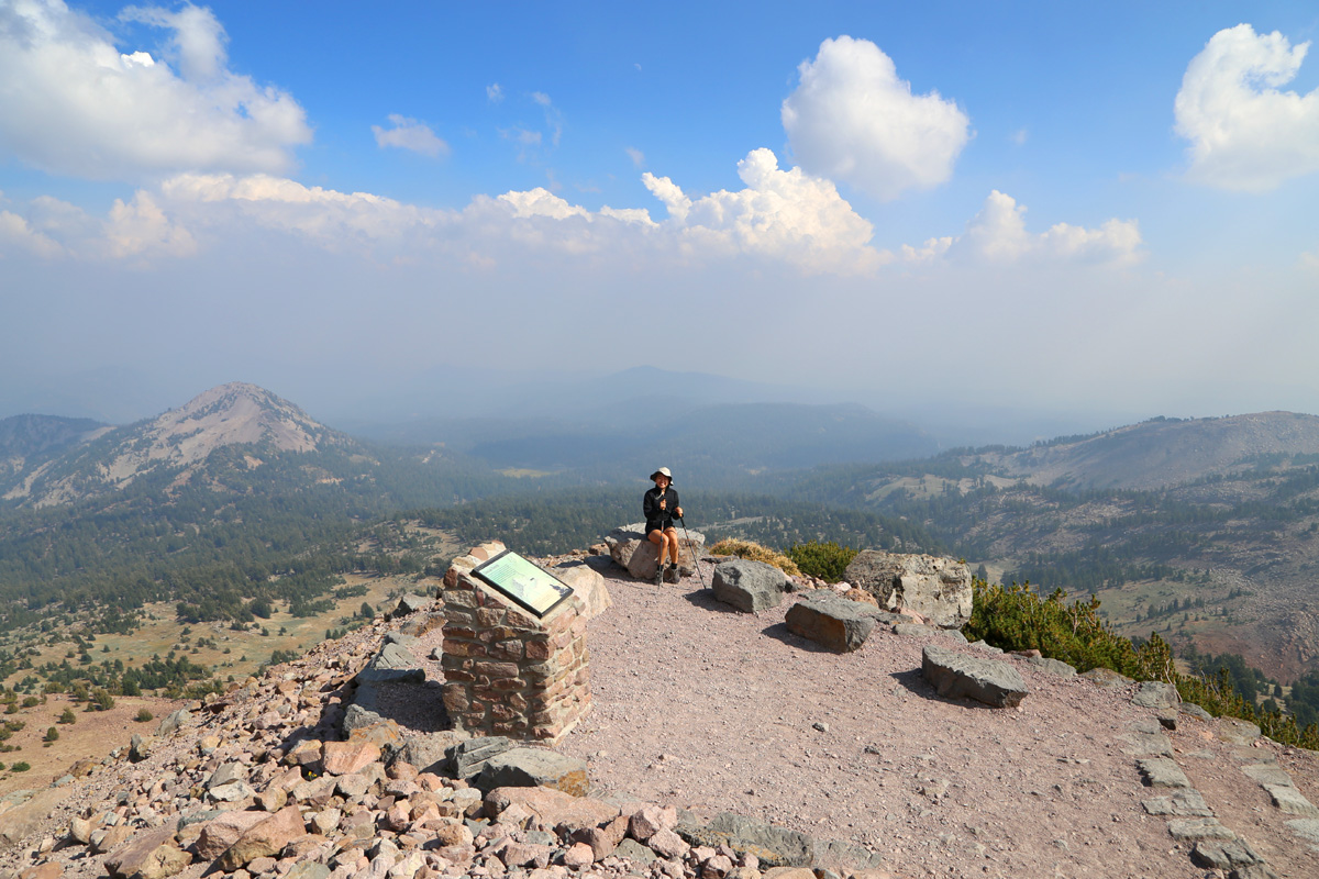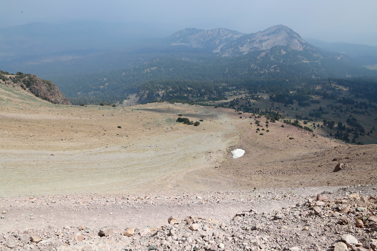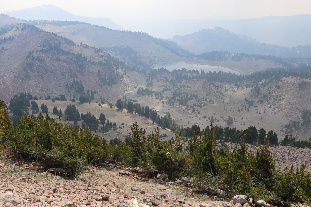 뒤를 돌아서 아래를 내려다 보면 당시 산불연기 때문에 뿌연 하늘 아래로 오전에 들렀던 헬렌 호수(Lake Helen)와 우리가 출발한 주차장이 보였다. 저 호수의 이름은 1864년에 백인 여성으로서는 최초로 래슨의 정상에 오른 Helen Tanner Brodt의 이름을 따서 지었다고 한다.