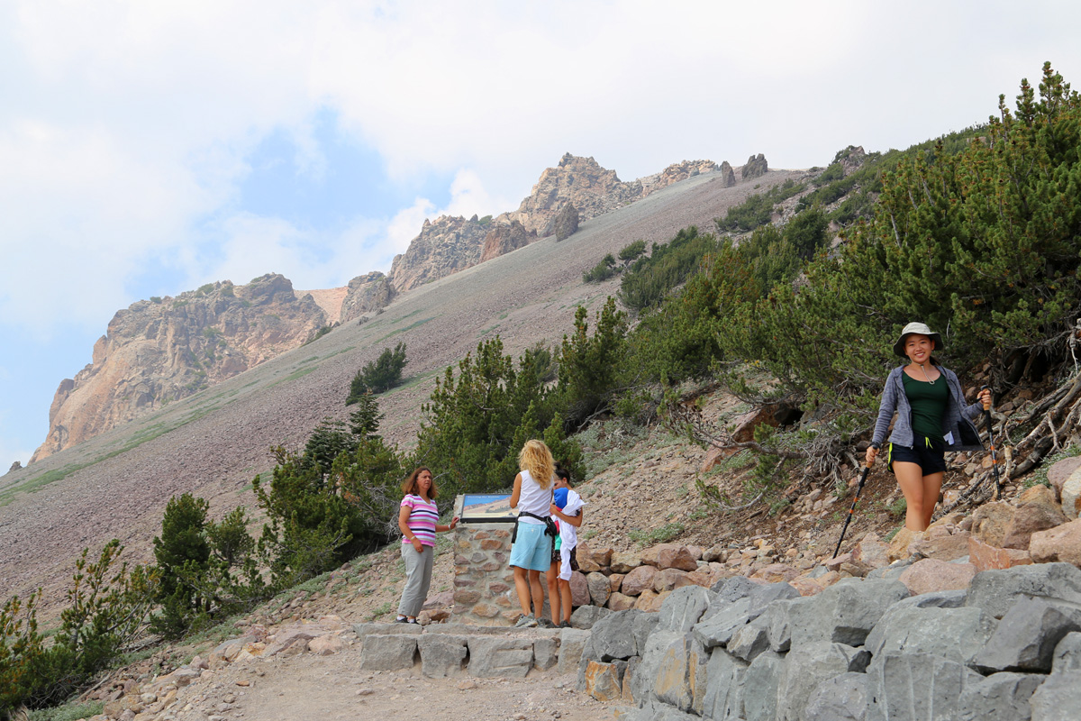 래슨피크(Lassen Peak)는 약 27,000년전에 분출된 용암이 굳어져서 만들어진 플러그돔(plug dome) 화산인데, 저 위의 바위들이 만들어질 당시의 옛모습을 보여주고 있는 것이란다. 왼쪽 바위에는 화산답게 '불의 신' 벌칸의 눈(Vulcan's Eye)이 또렷이 새겨져 있다. 멀리 4명의 여성분이 함께 올라가는 것이 보이는데, 트레일은 오른편으로 꺽어져서 돌아서 올라가게 되어 있었다.
