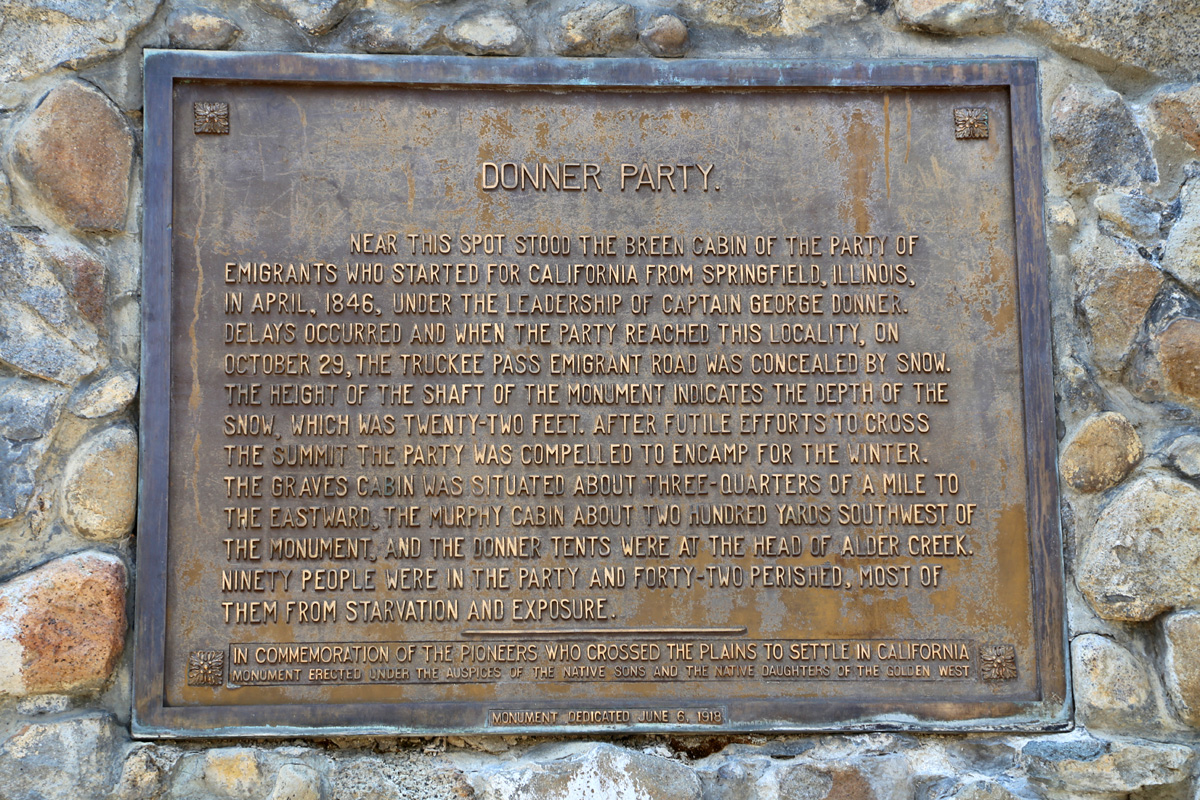기념비 뒤쪽의 동판에는 도너파티(Donner Party)에 대한 설명과 왜 이렇게 기단을 높이 만들었는지에 대한 설명이 있다.