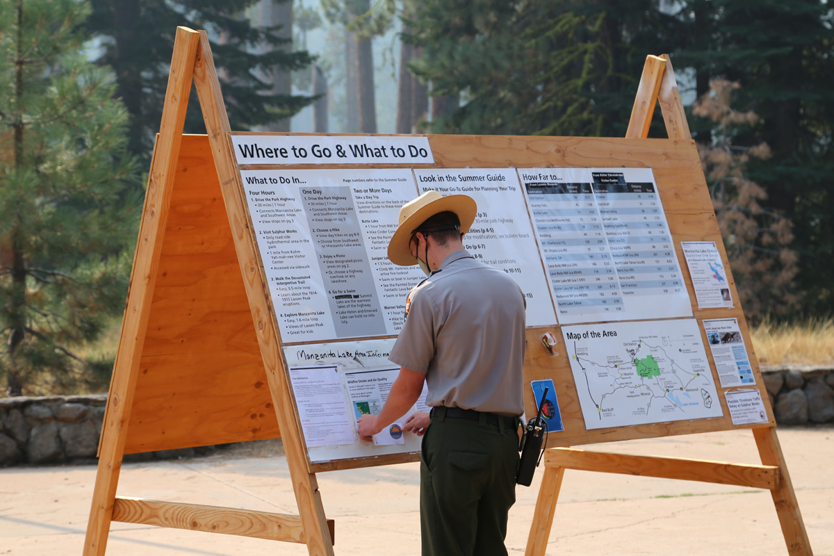 다시 돌아나와서 비지터센터에 도착하니, 마스크를 쓴 레인저가 커다란 야외 임시 안내판에 필요한 정보를 붙이고 있었다.