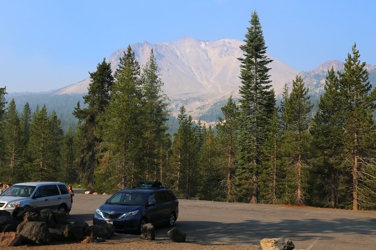 트레일 주차장에서 돌아보면, 여기서 약 3마일 떨어진 래슨 화산의 가운데 뾰족한 해발 3,187 m의 정상이 잘 보였다.