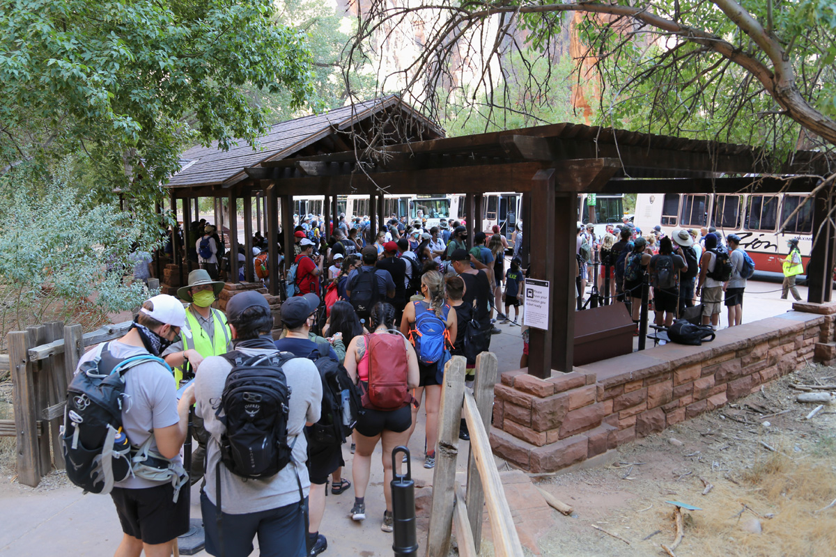 시나와바템플(Temple of Sinawaba) 정류소에서 셔틀버스를 타려는 사람들의 긴 줄인데, 미리 예매한 버스표 검사를 또 했다. 소셜디스턴싱 때문에 버스에 많이 태우지도 않아 30분 이상을 기다려 탑승을 했고, 주차장에 세워둔 우리 차로 돌아가서야 물에 푹 젖은 등산화를 벗은 다음에 차를 몰고 호텔로 돌아갔다.