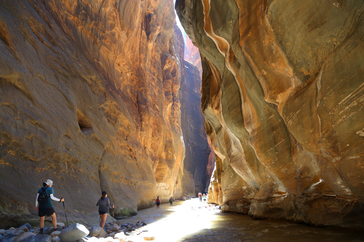 더 내려가면 이번에는 왼편으로 음침한 골짜기가 갈라지는데, 지금 두 분이 걸어나고 있는 협곡이 캐녀니어링(Canyoneering) 코스로 인기있다는 오더빌캐년(Orderville Canyon)이다. 아침에는 올라갈 때는 그냥 지나쳤었지만, 이번에는 우리도 조금 저 속으로 조금 걸어들어갔다.