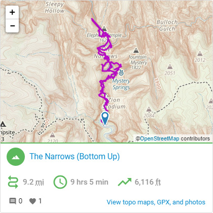 3부작으로 소개한 이 날의 전체 하이킹 경로를 가이아GPS 앱으로 기록한 것인데, 전체 소요시간만 빼고 거리와 등반고도는 정확하지가 않다. 클릭해서 확대지도에 찍힌 경로를 보시면 알겠지만, 협곡이 너무 깊어서 GPS 신호가 잘 안 잡혀 기록된 경로가 대부분 강물을 벗어나 엉뚱한 곳을 지나간 것으로 되어있기 때문이다.