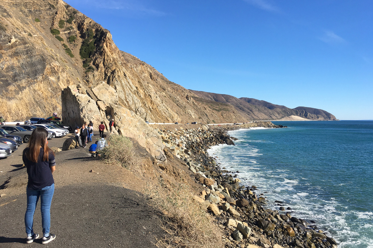 맛있게 다 먹고는 차에서 내려 저 멀리 모래가 산사면에 쌓인 곳을 바라보는 지혜~ 저기서 여기 포인트무구락(Point Mugu Rock)쪽 일몰을 바라보며 코로나가 빨리 끝나기를 바랬던게 벌써 8개월전이다... (당시 포스팅을 보시려면 클릭)