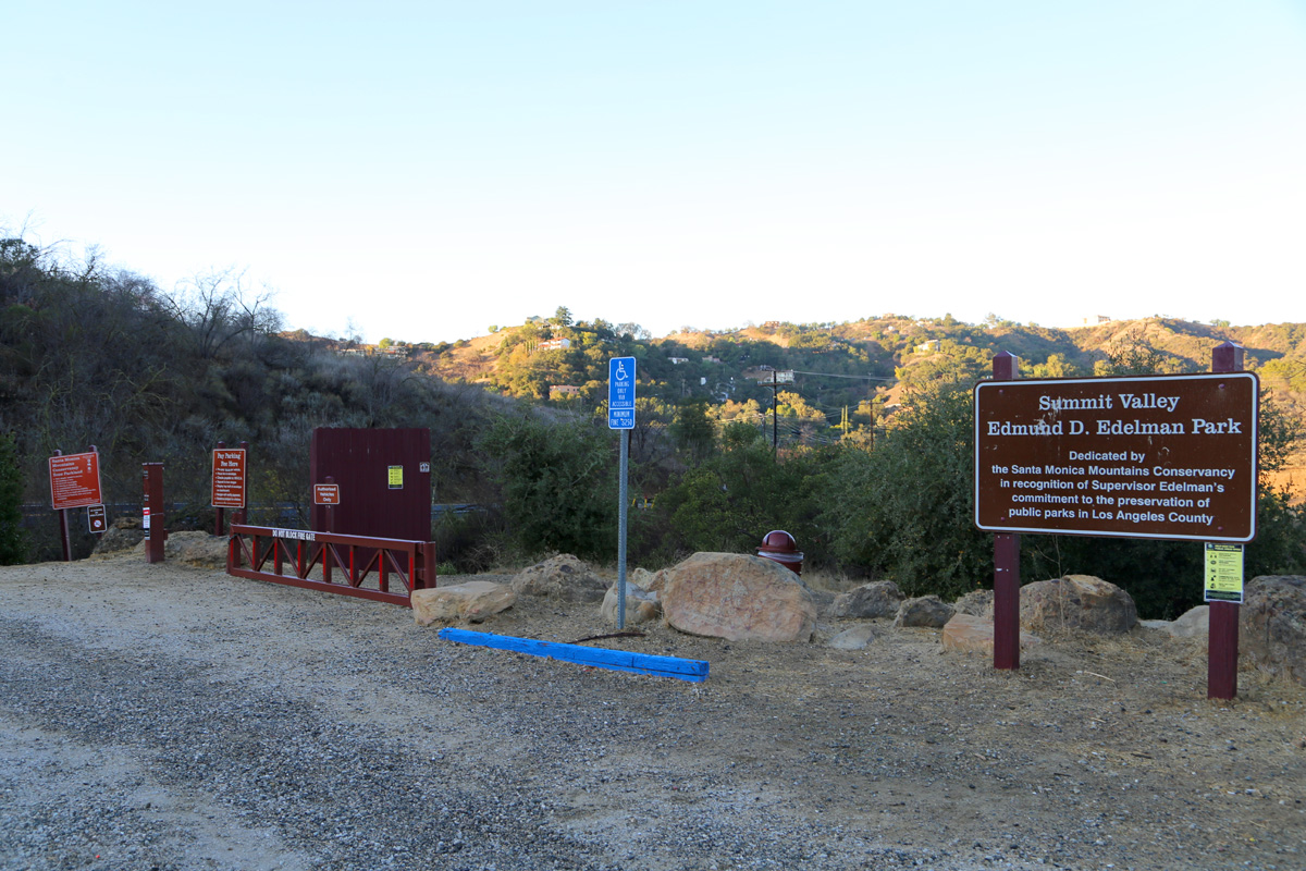 차를 세워둔 전망대를 포함해서 여기까지 내려온 등산로가 포함된 지역은 모두 서밋밸리 에드문드에델만 공원(Summit Valley Edmund D. Edelman Park)로 지정되어 있다. 여기 아래쪽 공원입구의 넓은 주차장을 놔두고 전망대에 주차를 한 이유는... 여기는 유료주차비 $5을 자율적으로 내야하기 때문이다.^^
