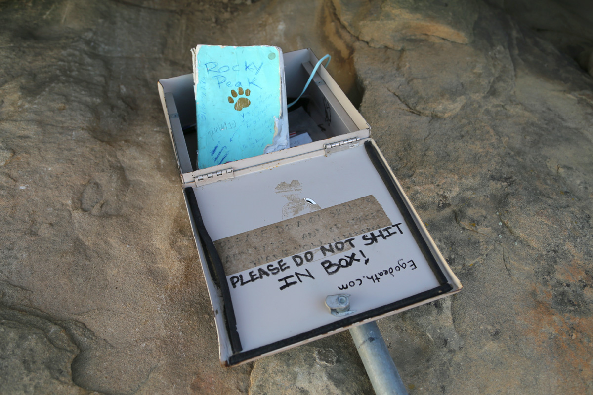 내려가기 전에 바위 밑에 숨겨놓은 마운틴박스를 찾아서 열어보았다. 그런데, 철박스 문짝에 써놓은 글은 장난으로 적은 것인지? 아니면 실제로 이 박스에 실례를 하는 사람이 있다는 말인가?