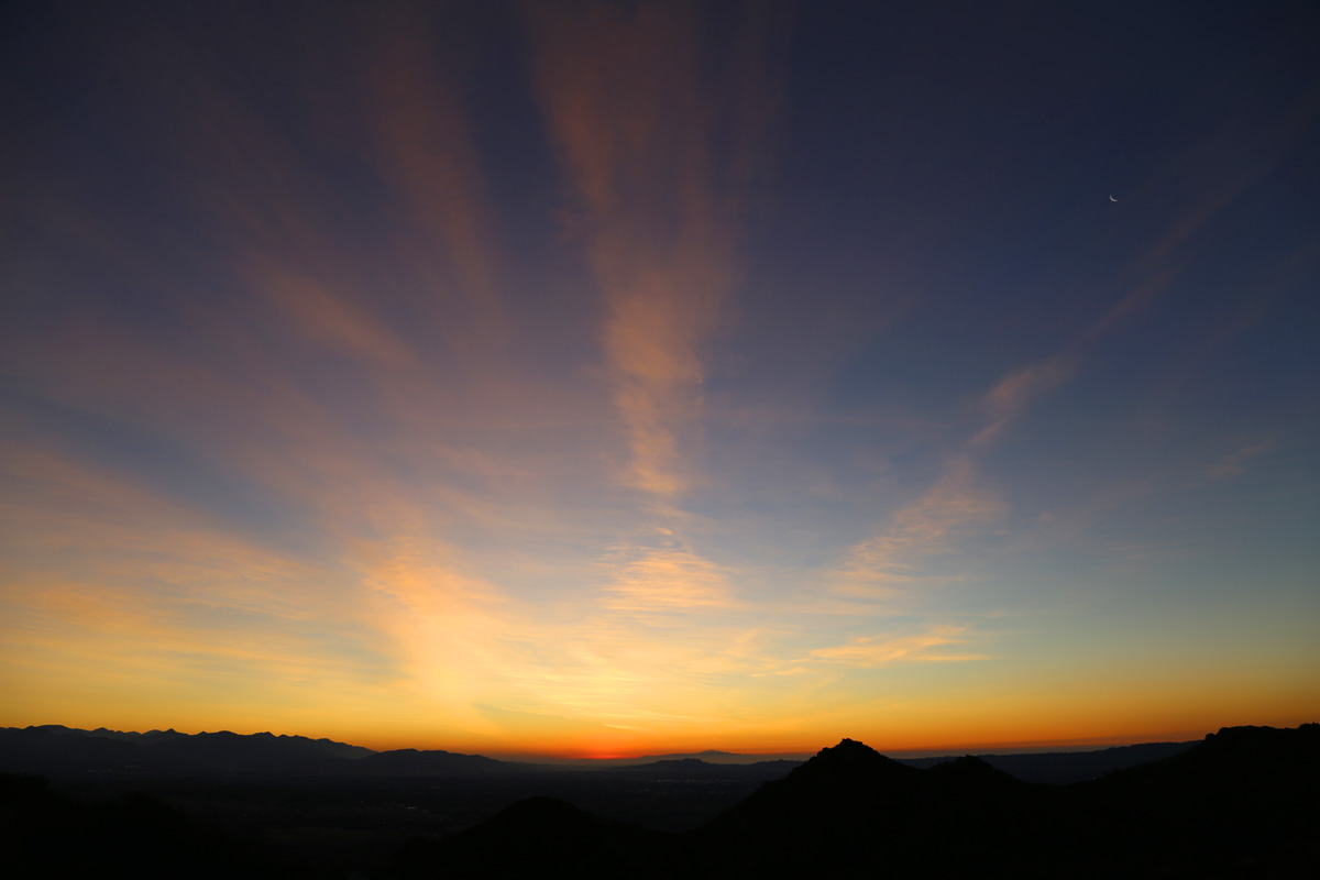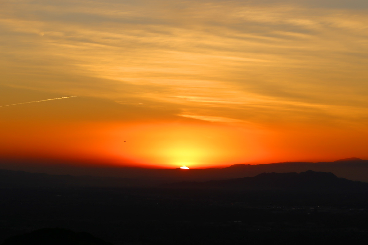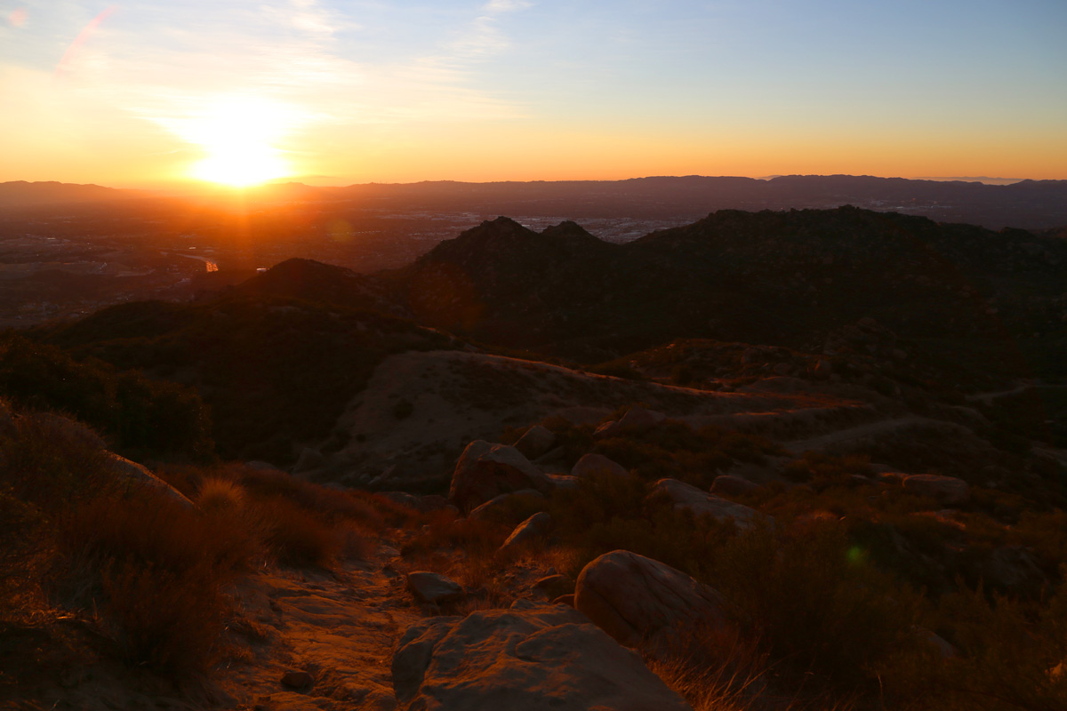 아직 정상까지는 조금 남았는데 벌써 해가 뜨려고 해서, 적당한 능선에 자리를 잡고 DSLR 카메라를 꺼냈다. 저 멀리 남동쪽이 LA다운타운 방향이라서 스모그에 묻혀서 벌써 해가 뜬 것이 아닌가 의심을 하는 와중에...
