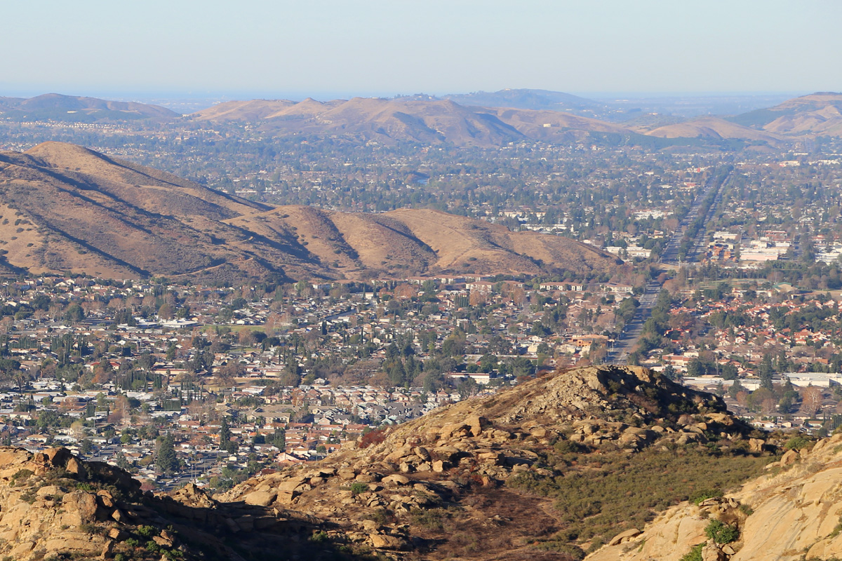 록키피크 정상에서 동쪽으로 내려다 본 모습으로 밝게 빛나는 118번 고속도로 주변의 주택가는, 2015년의 알리소캐년 가스누출(Aliso Canyon gas leak) 사고 때문에 주민들이 몇 달간 집을 떠나서 대피생활을 했던 포터랜치(Porter Ranch) 지역이다. (구글맵으로 위치를 보시려면 클릭)