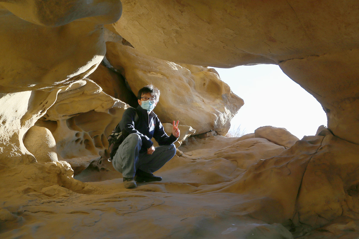 경사진 바위를 밟고 올라가면, 이렇게 유타주에서나 볼 수 있는 바람에 깍인 동굴속으로 들어갈 수가 있다. 그런데 이 사진만으로는 동굴의 크기가 잘 짐작이 되지 않으실 것 같아서...
