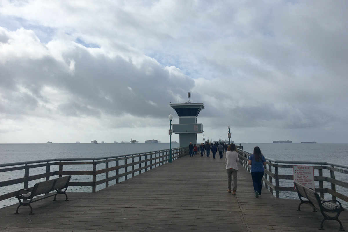 서쪽으로 멀리 건물과 배들이 보이는 곳이 롱비치 항구(Port of Long Beach)와 샌페드로 터미널(San Pedro Terminal)이다. 재미있는 사실은 퀸메리호가 있는 항구는 롱비치 시에 속하지만, 그 서쪽의 컨테이너 터미널은 행정구역상으로 로스앤젤레스 시에 속한다.