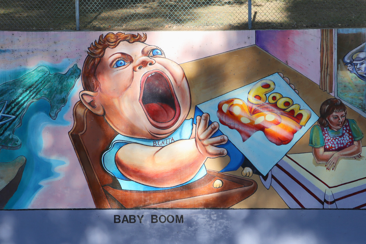 본류는 아니지만 앞서 보여드렸던 수역지도에도 표시된 터헝가워시(Tujunga Wash) 지류의 콘크리트 벽면에 그려진, 세계에서 가장 긴 벽화 중의 하나라는 'LA의 만리장성(Great Wall of Los Angeles)'의 가장 유명한 베이비붐 아기 그림이다.
