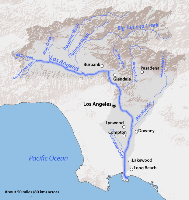 로스앤젤레스 강(Los Angeles River)의 물줄기와 수역(watershed)을 보여주는 지도로, 앞서 사진으로 보여드린 두 개울의 합류점에서 강이 시작되어, 거기서부터 약 50마일(80 km)을 흘러 롱비치(Long Beach)에서 태평양으로 흘러 들어가게 된다.