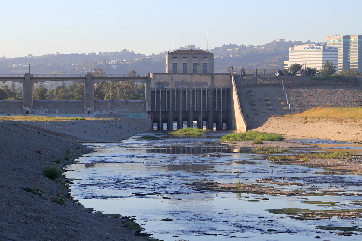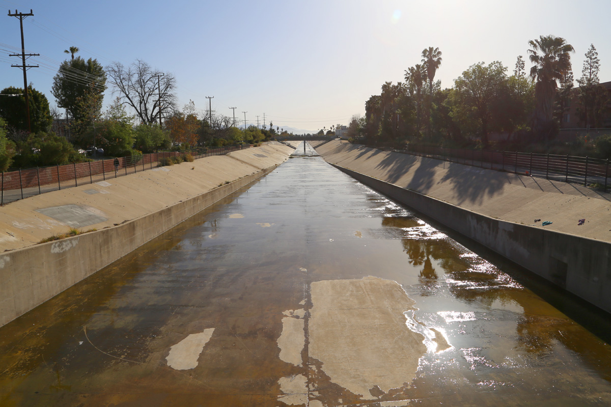 LA 다운타운의 동쪽을 흐르는 강의 모습을 잘 보여주는 항공사진으로 파란 강물과 많은 다리들이 보인다. LA강은 1938년의 대홍수 때 여러 곳의 강둑이 터지면서 114명 이상이 죽고 엄청난 재산피해가 발생한 후에, 전구간의 강둑은 물론 바닥까지 모두 콘크리트로 덮었다. 그래서 여름철에 강물이 말랐을 때는 콘크리트 강바닥에서 자동차 경주가 벌어지기도 하고 심지어 우주선이 착륙하기도 한다!