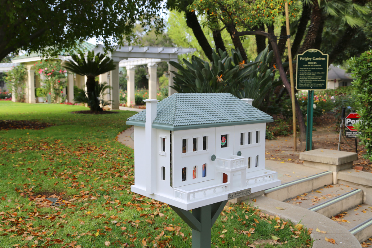 하지만, 뒷뜰의 장미정원인 리글리가든(Wrigley Garden)은 항상 개방이 되어있다. 앞에 보이는 이 집의 모형은 처음에는 우편함인 줄 알았는데, 열어보니 책이 들어있는 무료 길거리 도서관이었다.