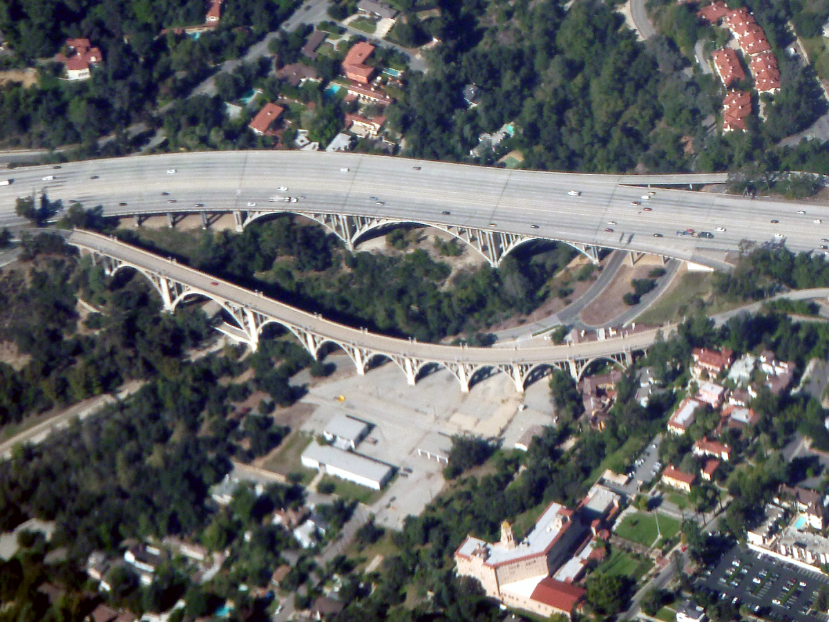 왼쪽의 콜로라도스트리트브리지와 오른쪽의 134번 고속도로의 가운데에서 두 다리의 아치들을 함께 볼 수 있다. 이상하게 두 도로가 나란하게 달리지 않는데, 이해를 돕기 위해서 위키피디아에서 가져온 항공사진 한 장을 보여드린다.