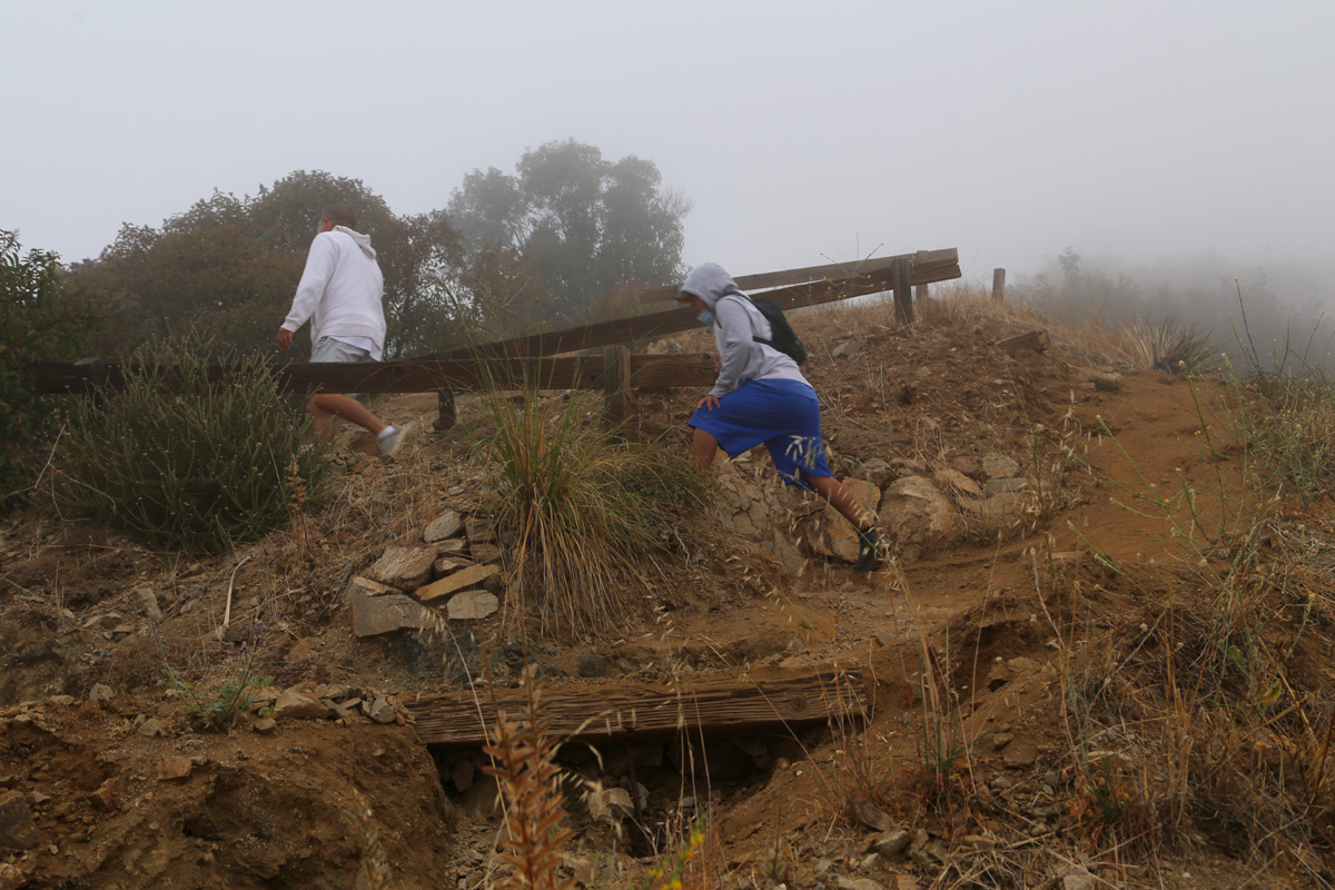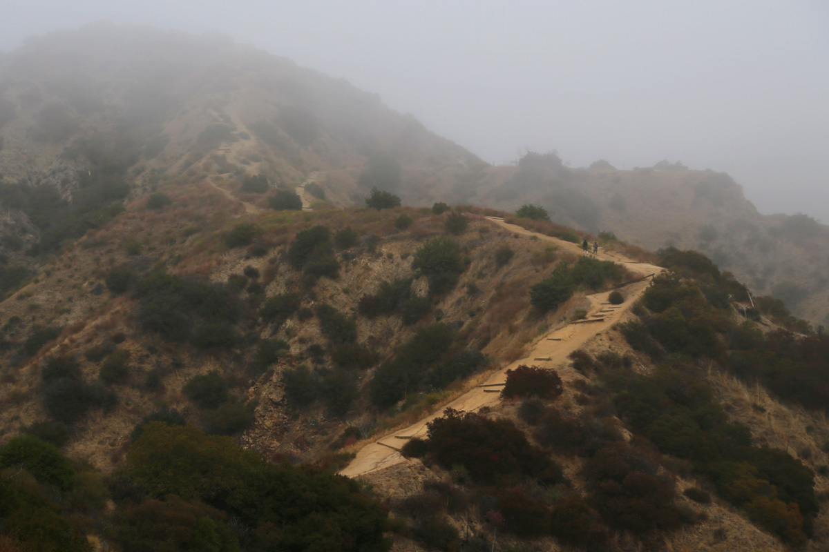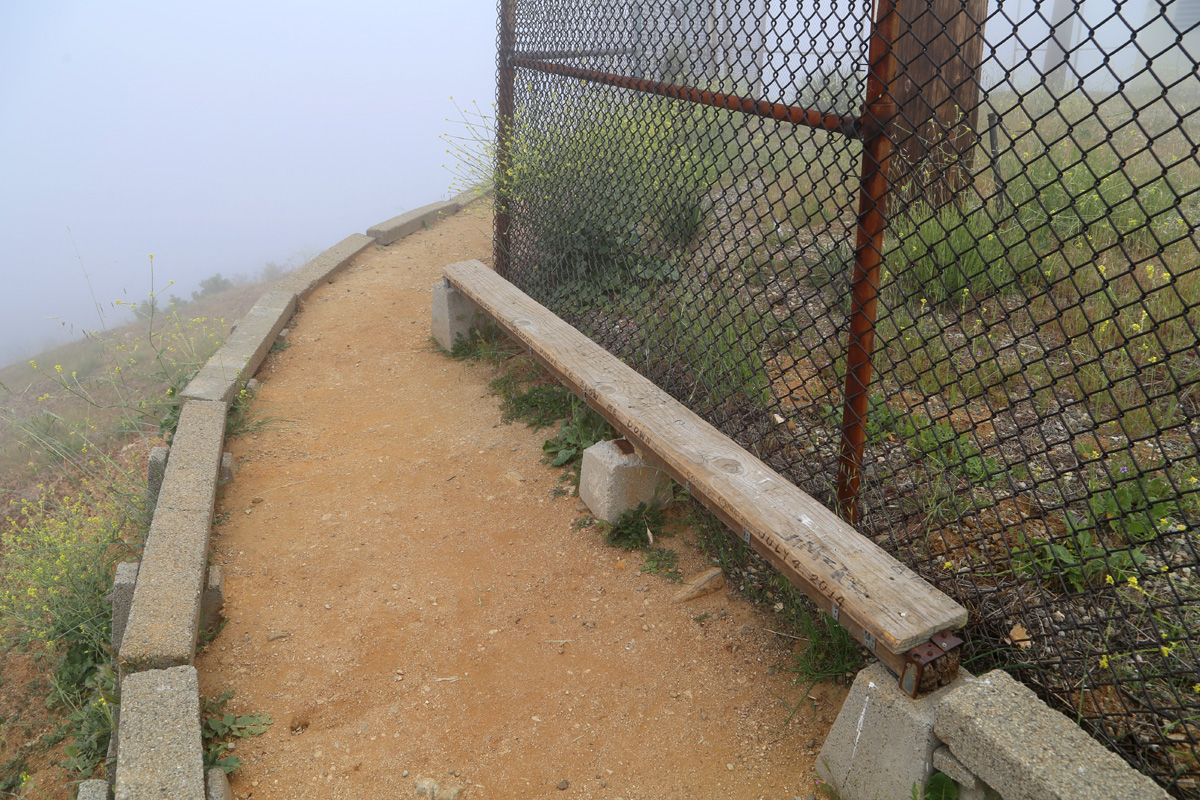 정상에는 철조망에 둘러싸인 무슨 시설이 있고, 그 둘레를 따라서 걸으면 남향으로 이렇게 벤치가 놓여져 있다. 저기 앉아서 준비해간 아침과 커피를 먹으며 20분 이상 기다렸지만 구름이 걷힐 기미가 전혀 보이지 않았다. (버두고 산맥에 대한 소개와 내려다보는 LA 경치가 궁금하신 분은 여기를 클릭하시면 됨)