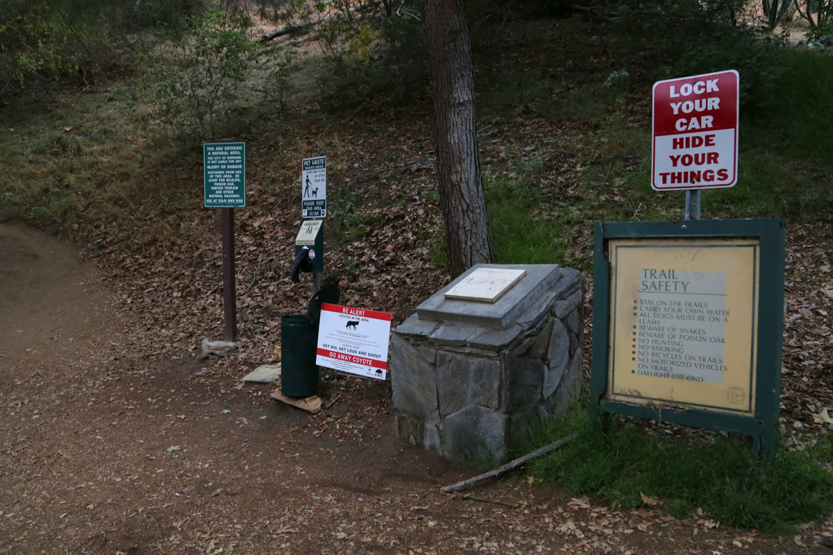 공원밖에 주차를 하고 입구에서부터 바로 급경사를 올라가는 트레일을 시작했다. 귀중품은 안 보이게 숨기고 차문을 잘 잠그라는 안내가 주차장에서부터 여러 번 나왔는데, 산 아래 외진 곳이다 보니 '빈차털이'가 자주 발생하는 모양이다.