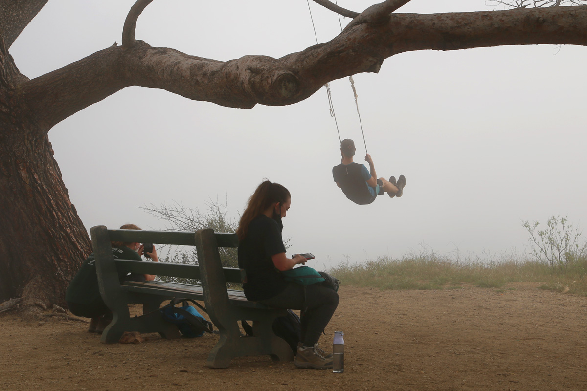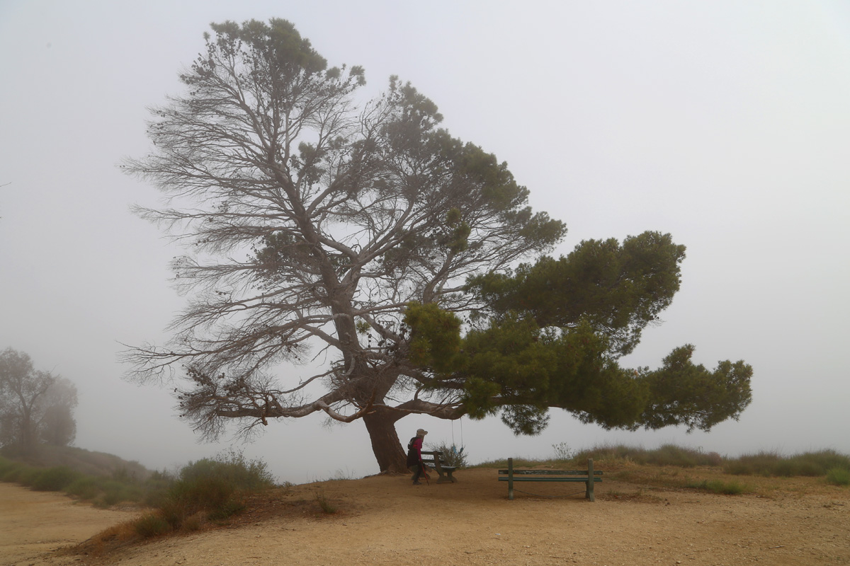 돌아서 내려가는 길에 앞서 표지판 뒤로 잠깐 보여드렸던 그 나무를 찾아갔다. 구글맵에는 '생명의 나무' 트리오브라이프(Tree of Life)로 표시되어 있는데, 딱 봐도 뭔가 영험해 보인다. 특히 저 나무 아래 벤치에 앉아서 바라보는 라크레센타 밸리와 그 너머 샌가브리엘 산맥의 풍경이 멋있다는데... 지금은 안개에 가려서 아무것도 안 보인다.