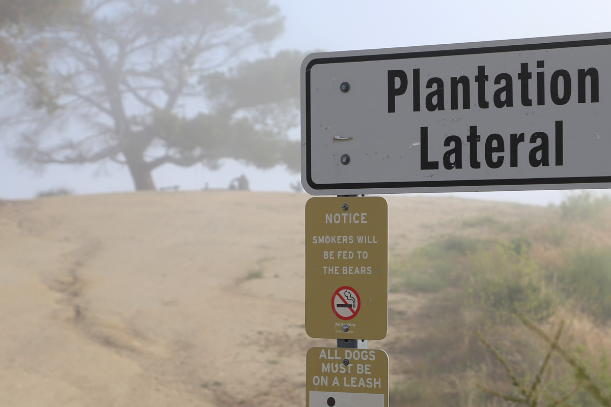 주능선의 Verdugo Mtwy 소방도로가 Plantation Lateral 길과 갈라지는 삼거리인데, 도로명 아래에 붙어있는 흡연금지 표지판에 씌여진 문구가 살벌하다~^^ 뒤로 희미하게 보이는 나무도 유명한데, 갑자기 구름이 더 몰려와서 내려오는 길에 가까이 가보기로 했다.