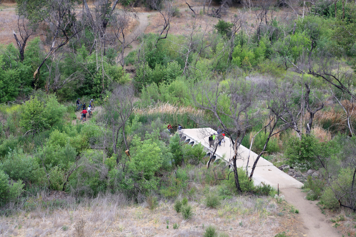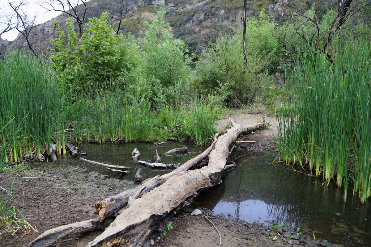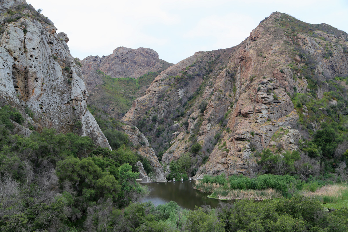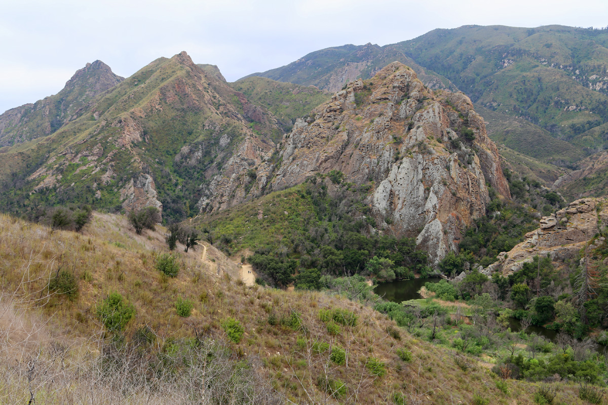 등산로가 Lookout Trail로 바뀌어서 언덕을 넘으면, 물줄기가 바위산을 휘감고 흘러가는 말리부크릭 주립공원의 절경을 만날 수 있다. 물론 하늘이 파랬으면 좋았겠지만 날씨가 계속 아침에만 흐린 'May Gray'였다. 참고로 멀홀랜드 하이웨이 도로변의 Cistern Trail Parking에 무료주차를 하고, 시스턴 트레일로 여기까지 걸어오는 방법도 있다.