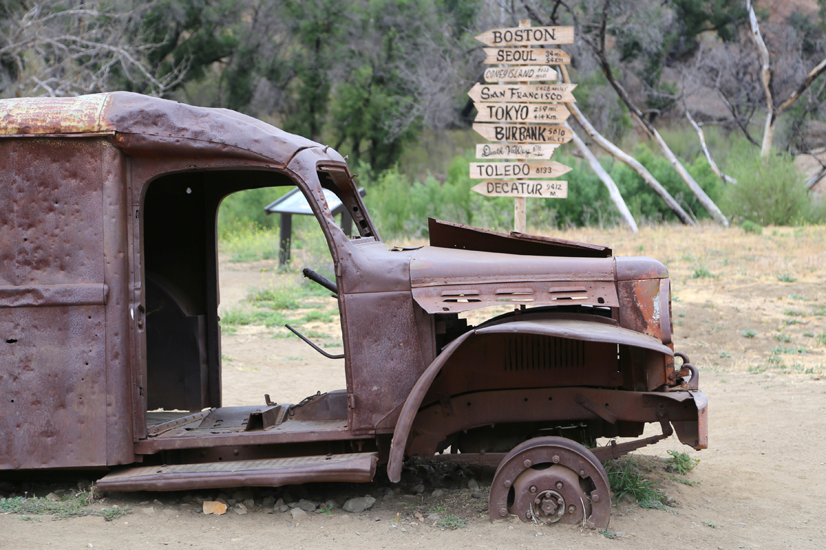 입구에 복원되어 있던 트럭과 같은 차종인 Dodge WC54 ambulance가 녹슨 껍질만 남아있는 뒤로 이정표(signpost)가 보이는데...